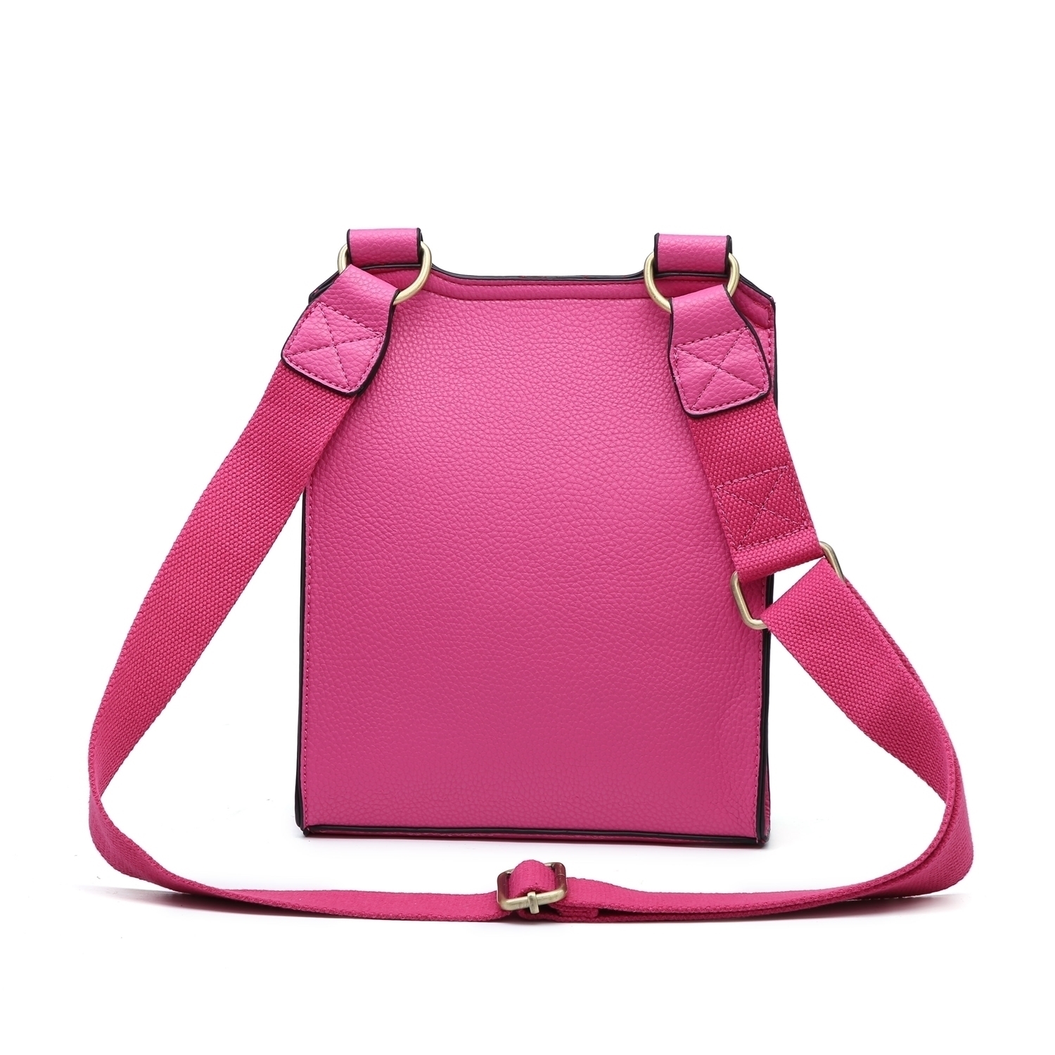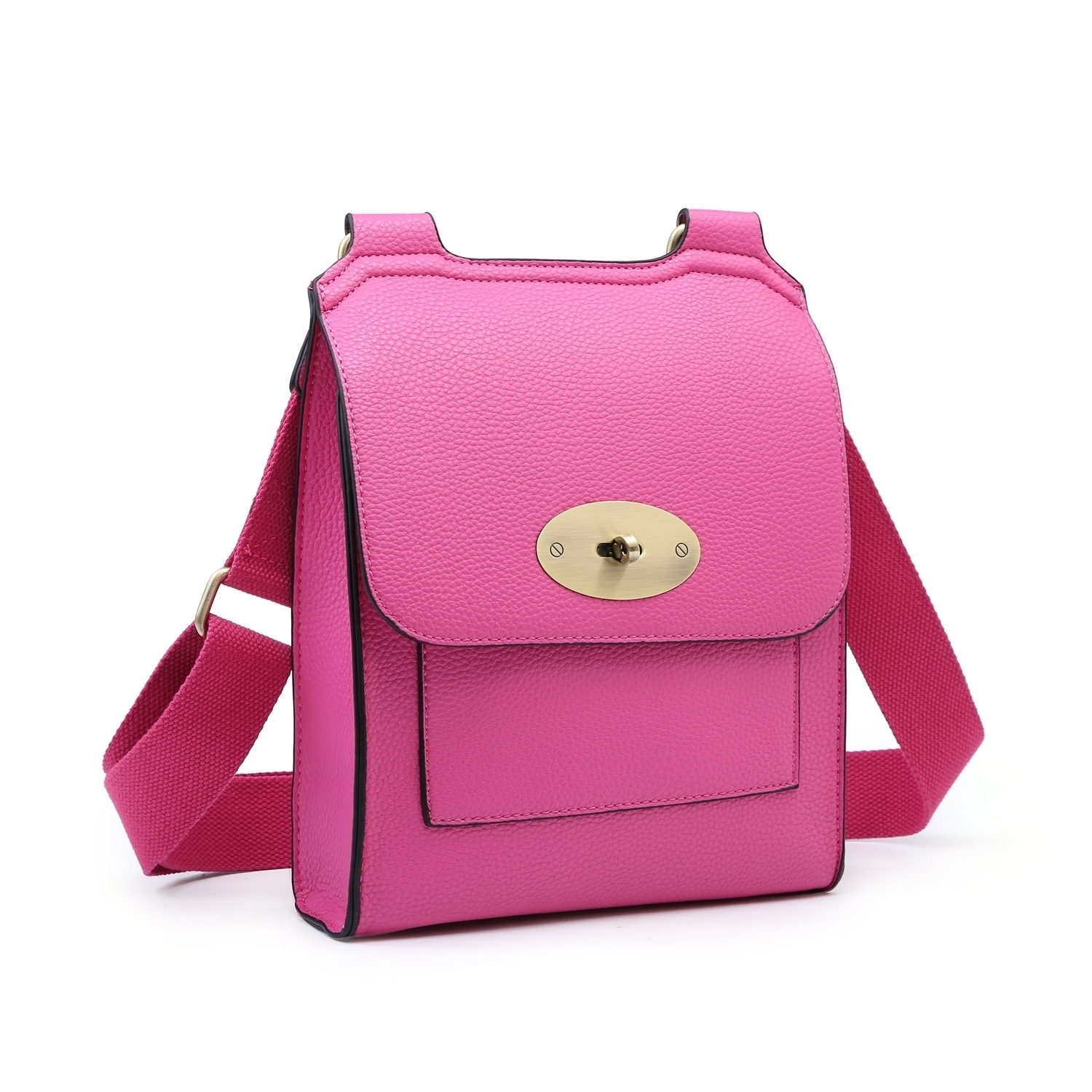 The body is crafted from a durable material with a prominent pebbled grain finish that offers a luxurious tactile feel. The interior is fully lined with a smooth, vibrant fabric that provides a pop of contrast. The strap is made from sturdy, wide woven webbing for superior comfort and durability.