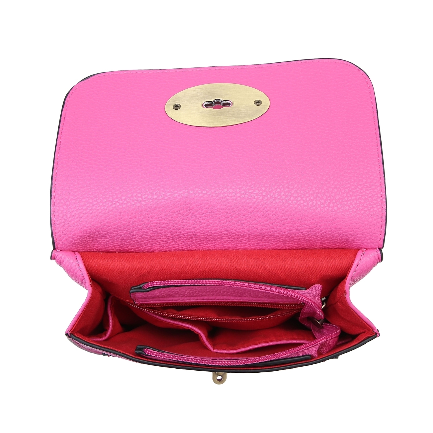 The front flap is secured with a classic metallic twist-lock clasp, opening to reveal a convenient front slip pocket for quick-access items. The interior is expertly organized, featuring a central zippered divider pocket that splits the main compartment, along with an additional zippered pocket on the back wall and slip pockets on the front wall. The exterior edges are finished with contrasting black piping for a defined look.