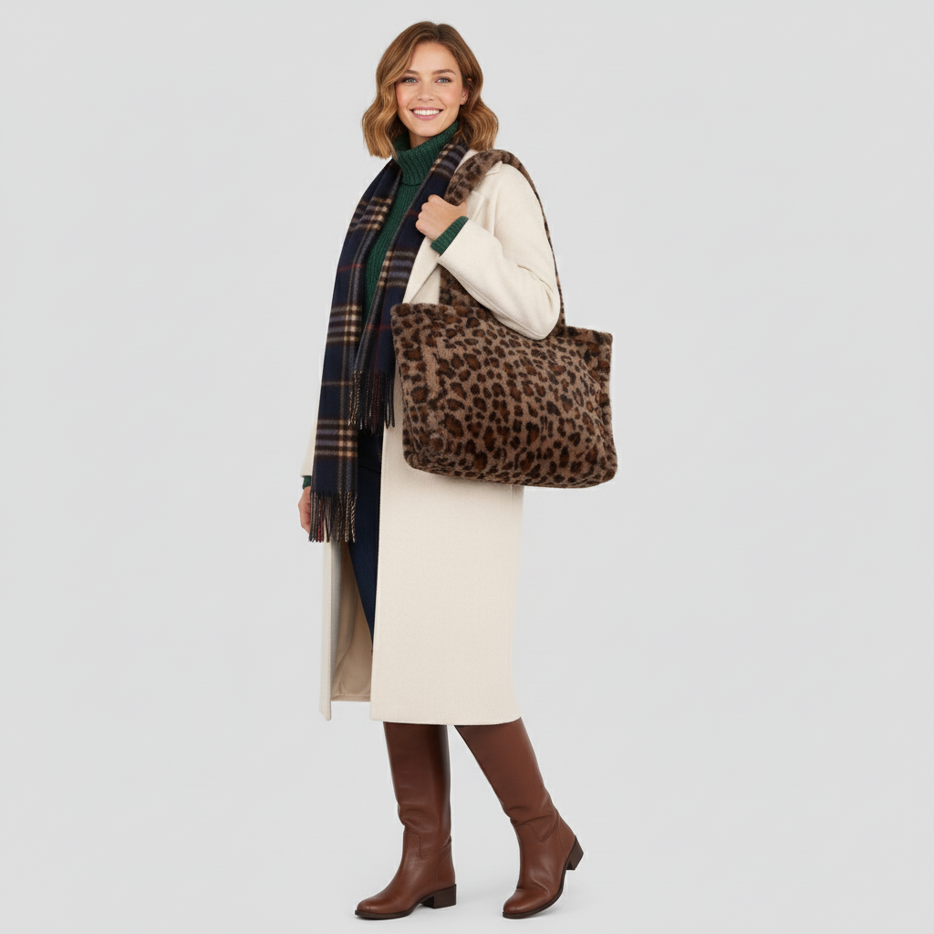 Its soft texture, functional size, and eye-catching leopard print make it the perfect statement piece for both casual and elevated looks.