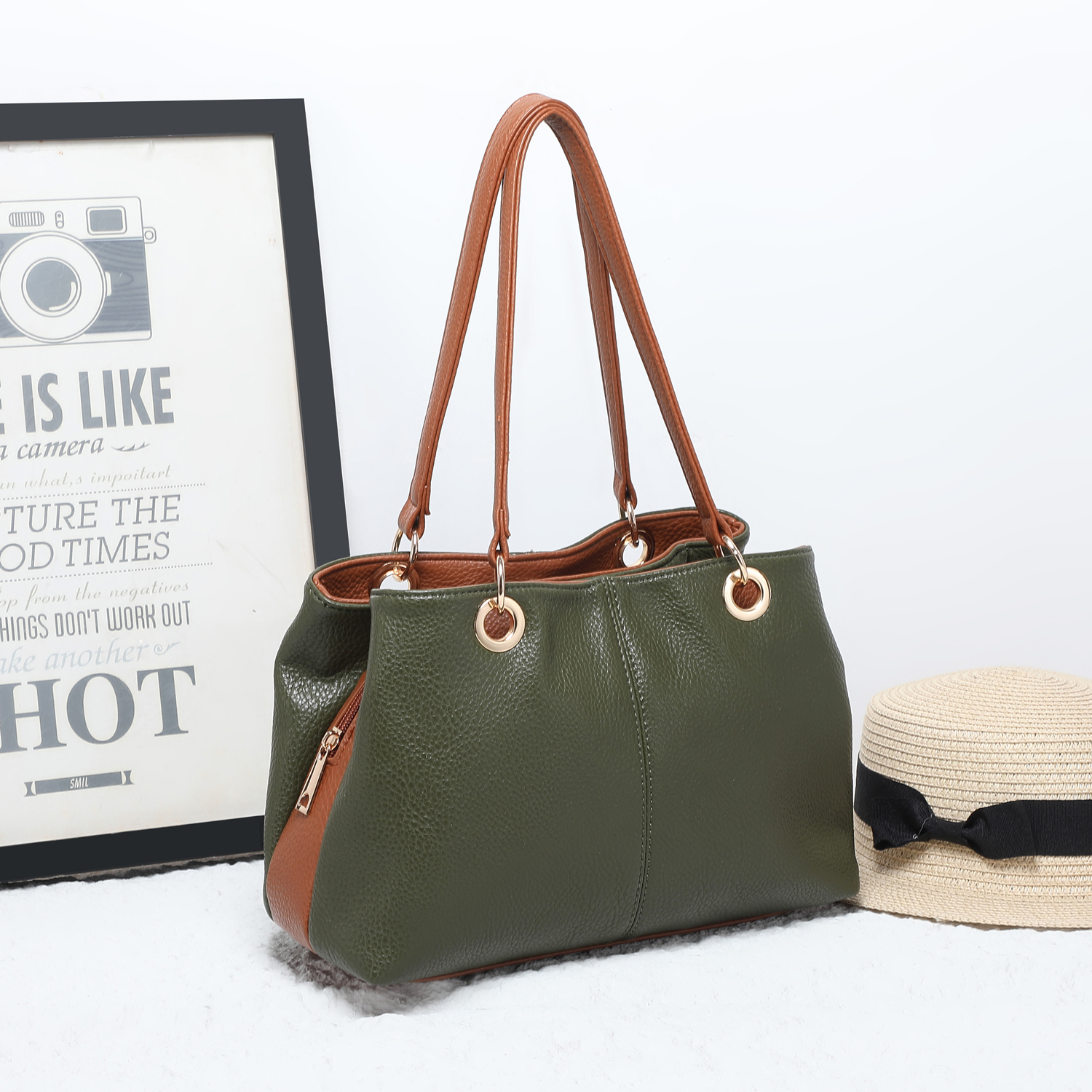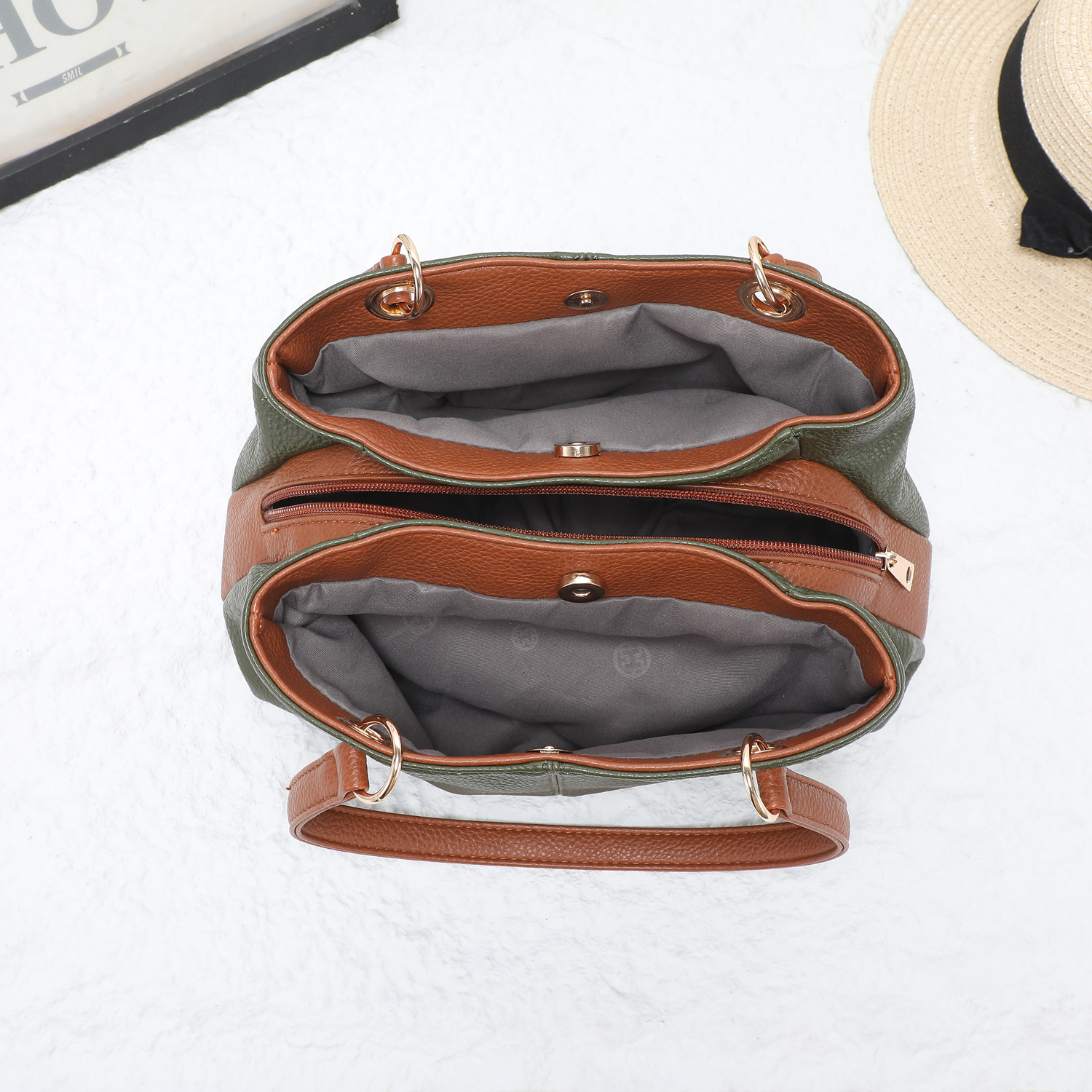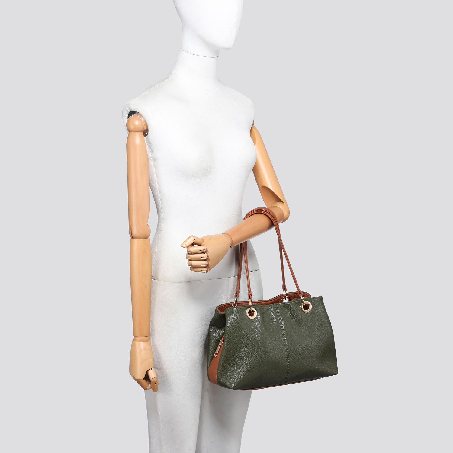 Refresh your accessory collection with this chic two-tone tote bag. Featuring a sophisticated olive green pebbled finish with contrasting cognac brown accents, it offers a stylish color-block look without sacrificing functionality.