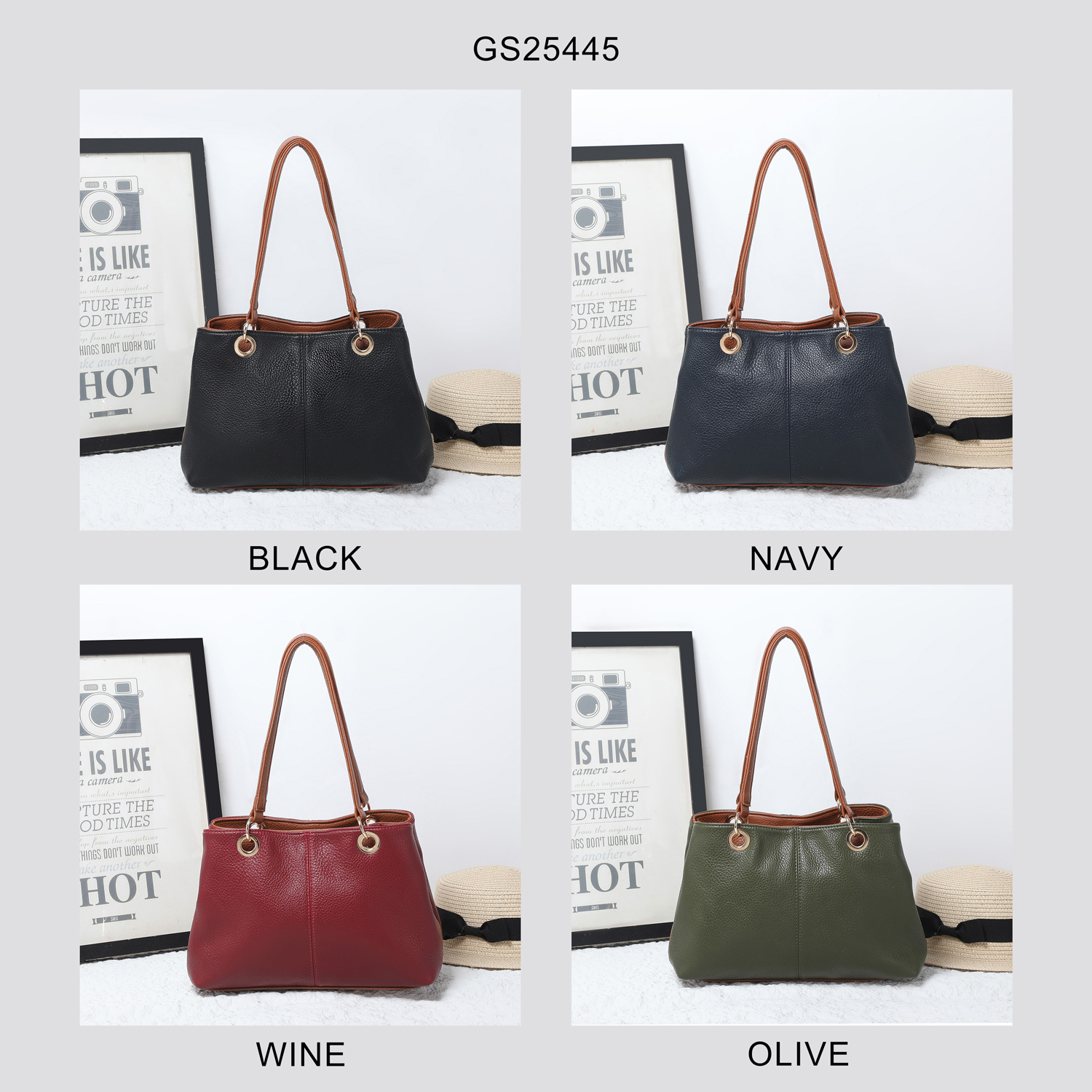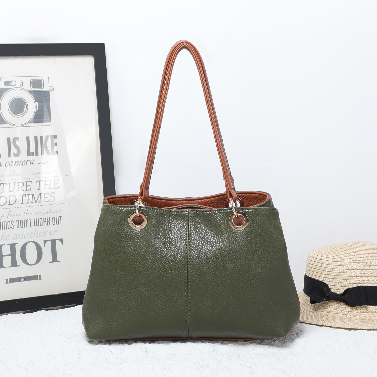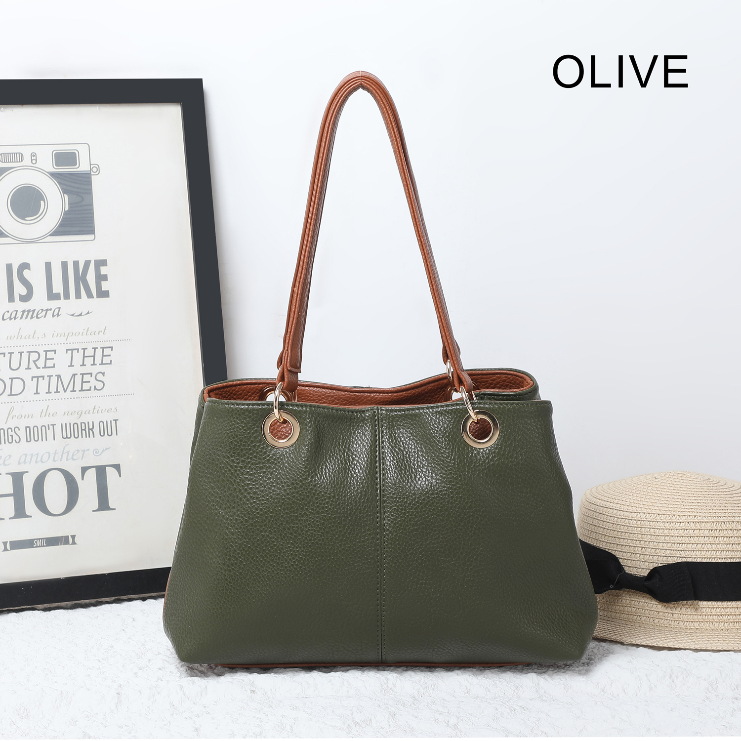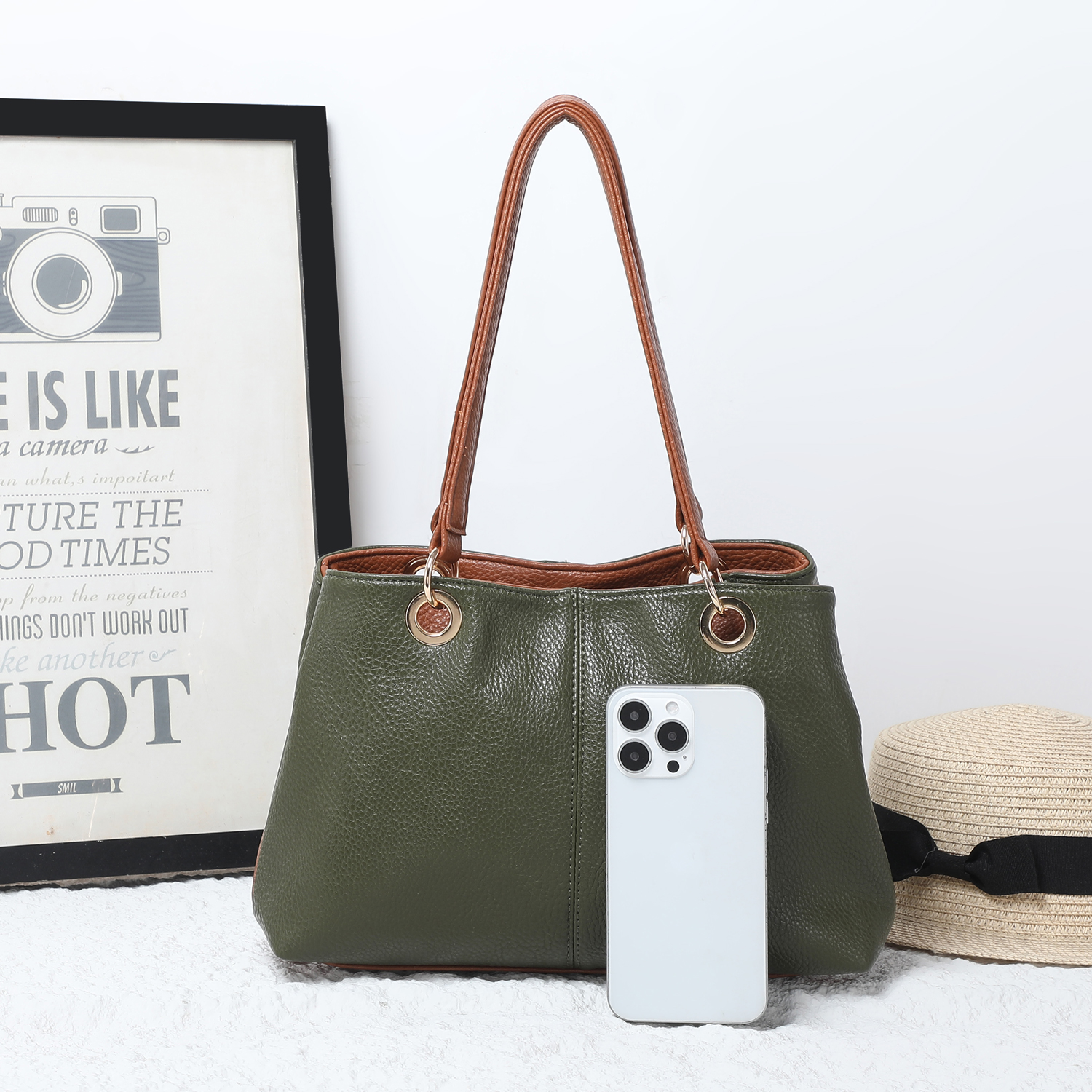 Refresh your accessory collection with this chic two-tone tote bag. Featuring a sophisticated olive green pebbled finish with contrasting cognac brown accents, it offers a stylish color-block look without sacrificing functionality.