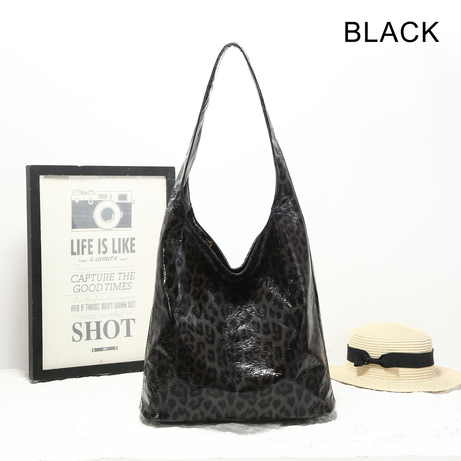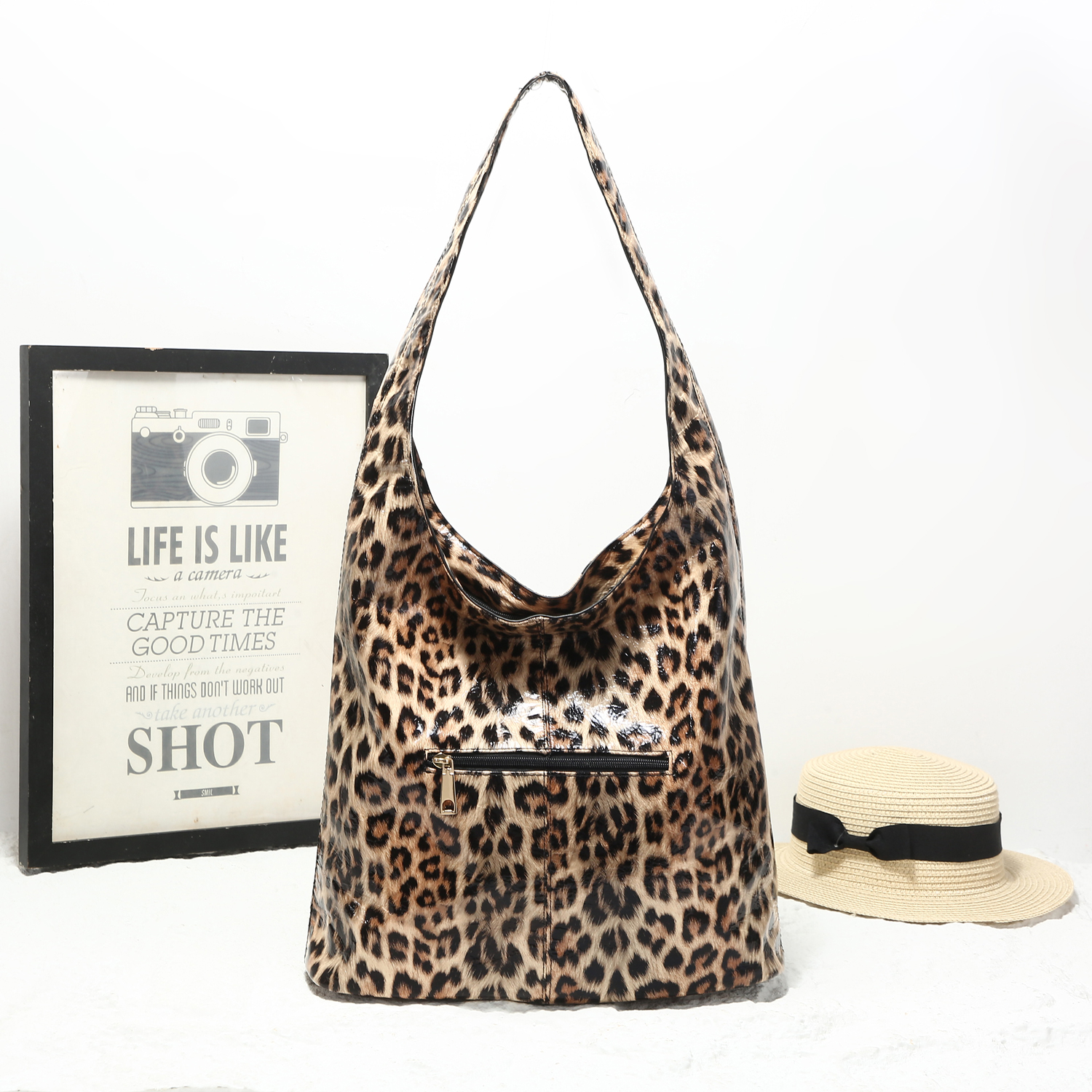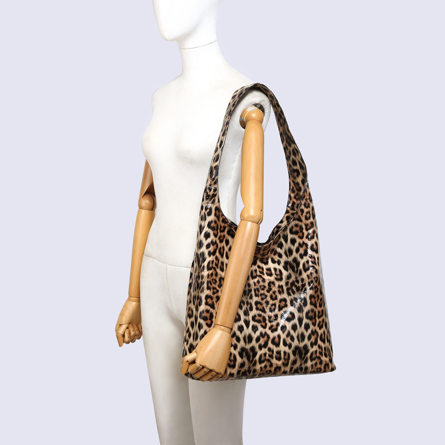 Unleash your wild side with this bold, glossy leopard print slouch bag. Designed to turn heads, this spacious hobo-style tote combines a striking animal pattern with a relaxed, effortless silhouette for the ultimate statement accessory.