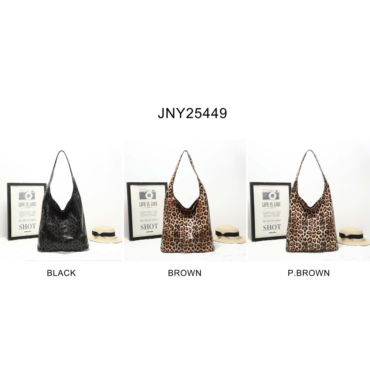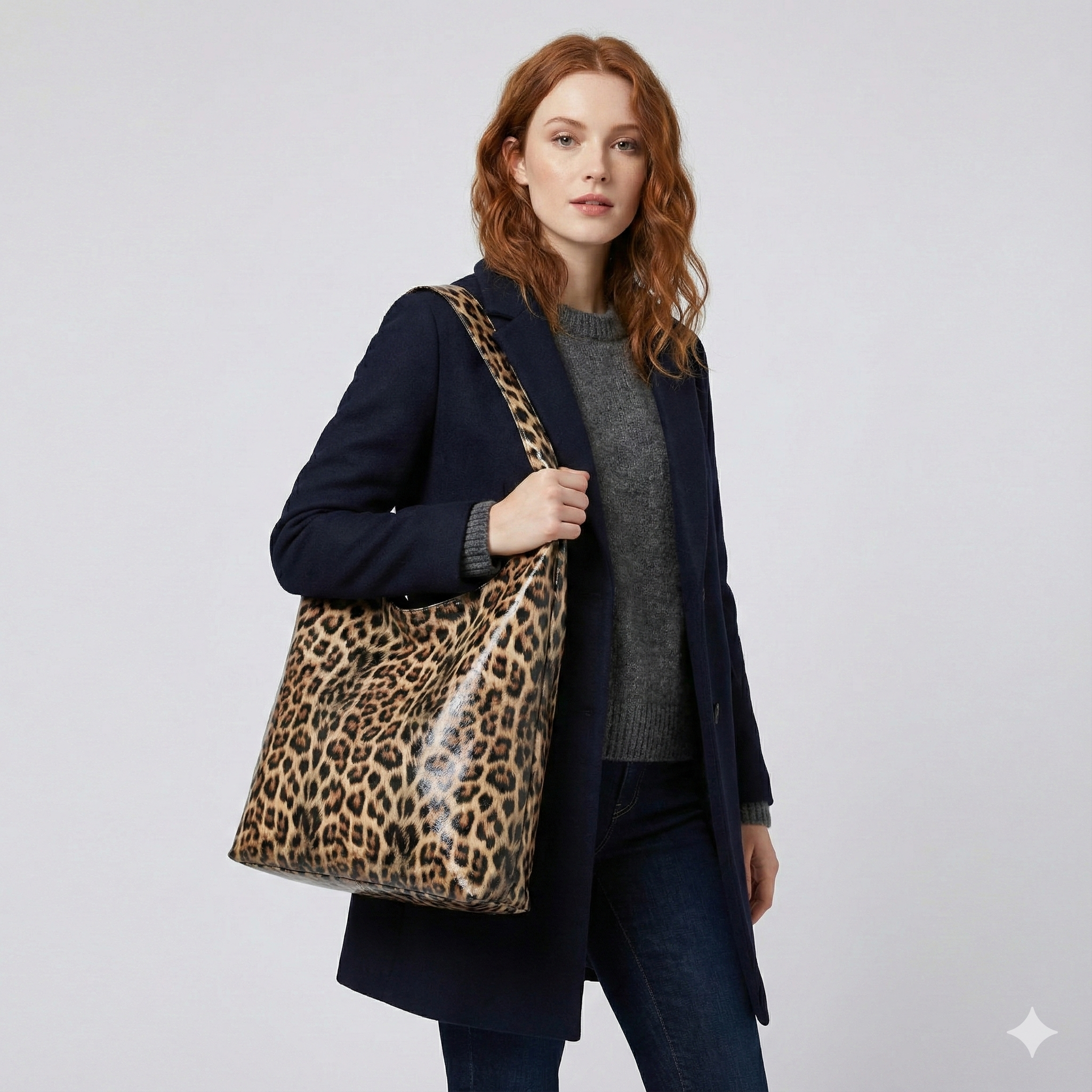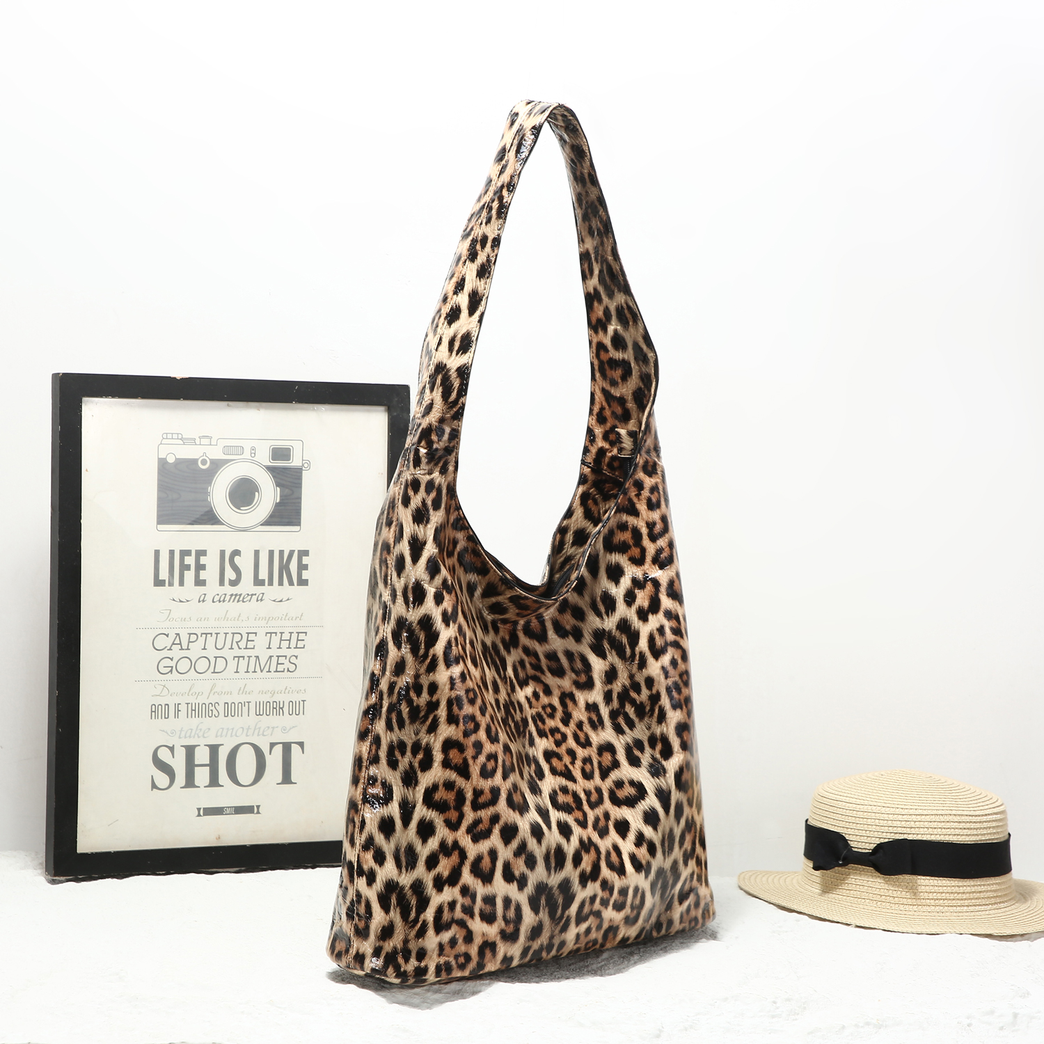 Unleash your wild side with this bold, glossy leopard print slouch bag. Designed to turn heads, this spacious hobo-style tote combines a striking animal pattern with a relaxed, effortless silhouette for the ultimate statement accessory.