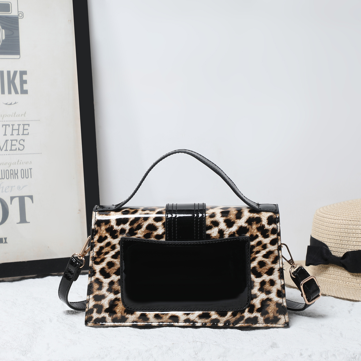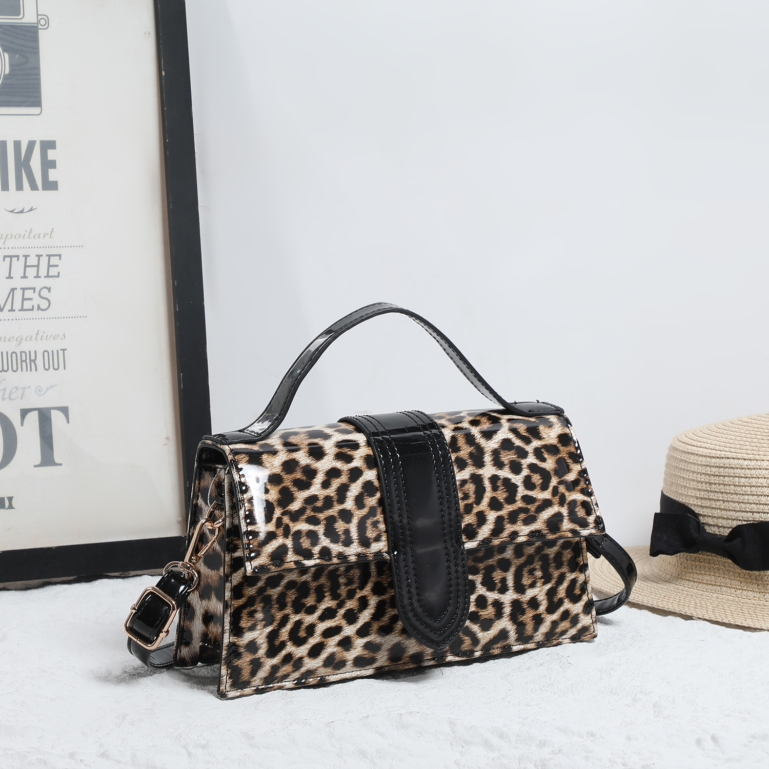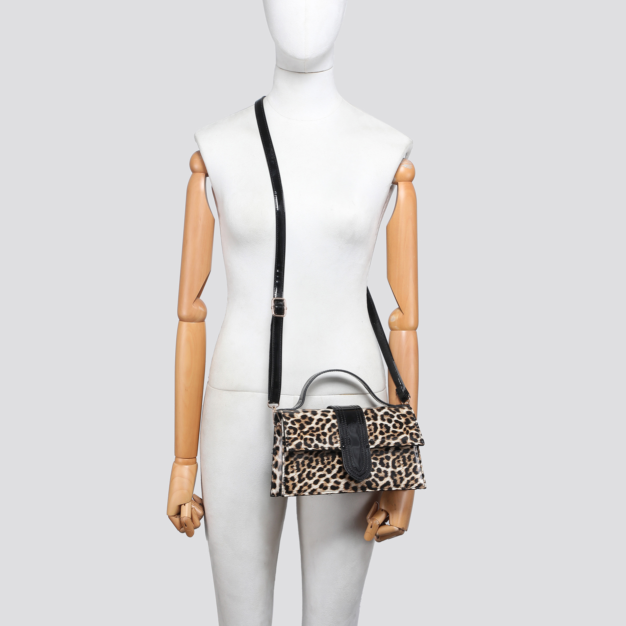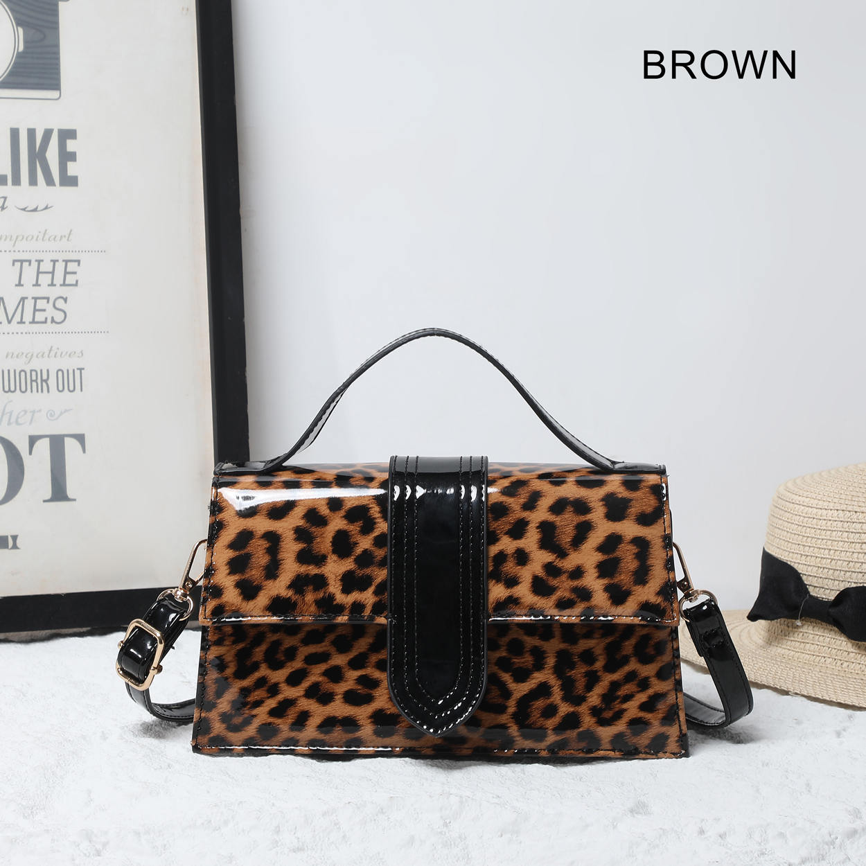 Make a striking impression with this structured crossbody bag, defined by its high-gloss finish and fierce animal print. The polished silhouette is elevated by a contrasting patent panel on the front, offering a luxurious edge to a classic design. Whether carried by the top handle or worn as a crossbody, this accessory adds a layer of sophisticated confidence to any ensemble.
