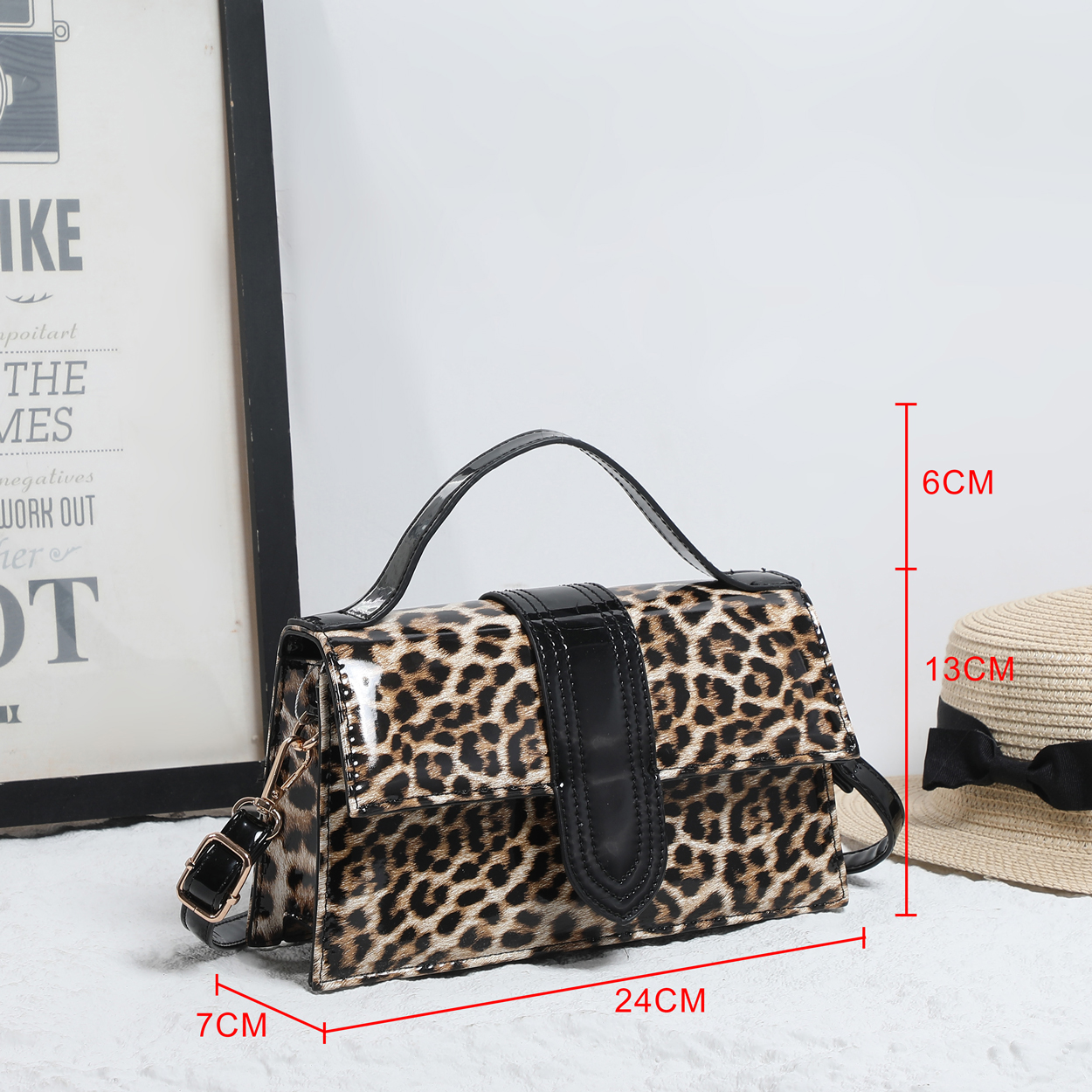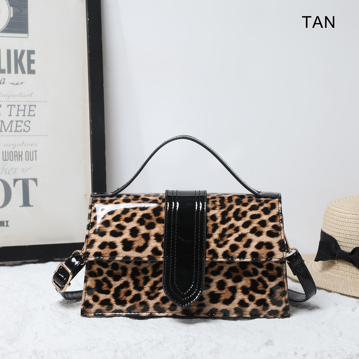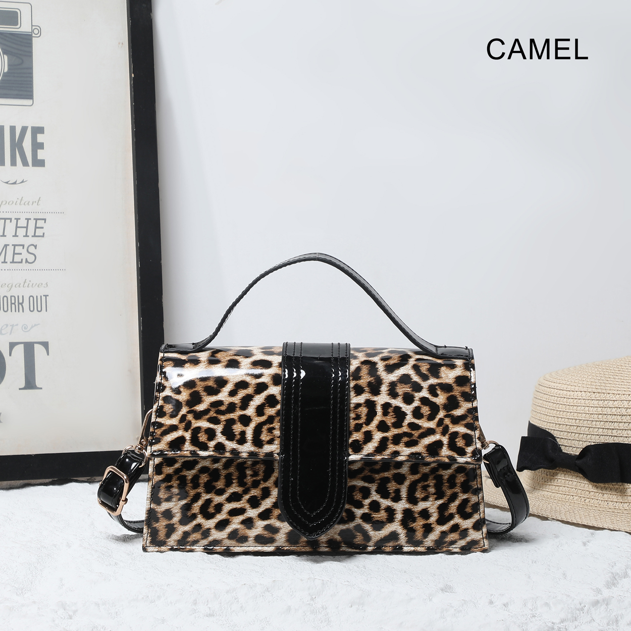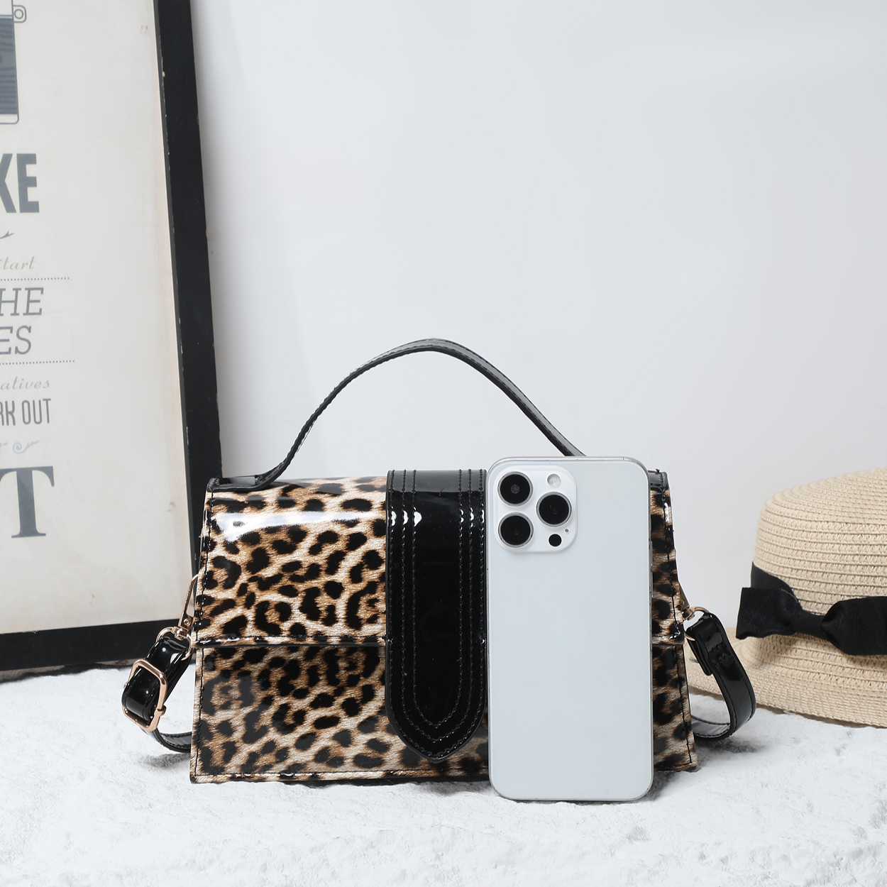 Make a striking impression with this structured crossbody bag, defined by its high-gloss finish and fierce animal print. The polished silhouette is elevated by a contrasting patent panel on the front, offering a luxurious edge to a classic design. Whether carried by the top handle or worn as a crossbody, this accessory adds a layer of sophisticated confidence to any ensemble.