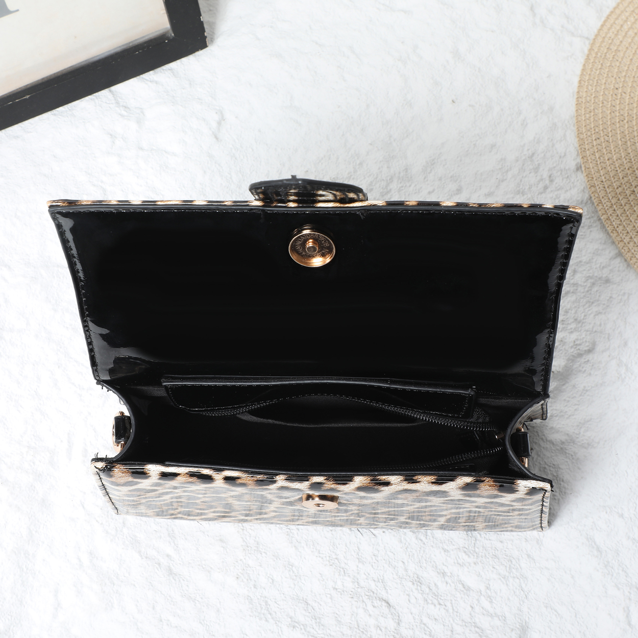 The exterior is crafted from a glossy material with a smooth patent finish, highlighting the vivid animal pattern. The interior is lined with a smooth, solid-toned fabric that protects your belongings.