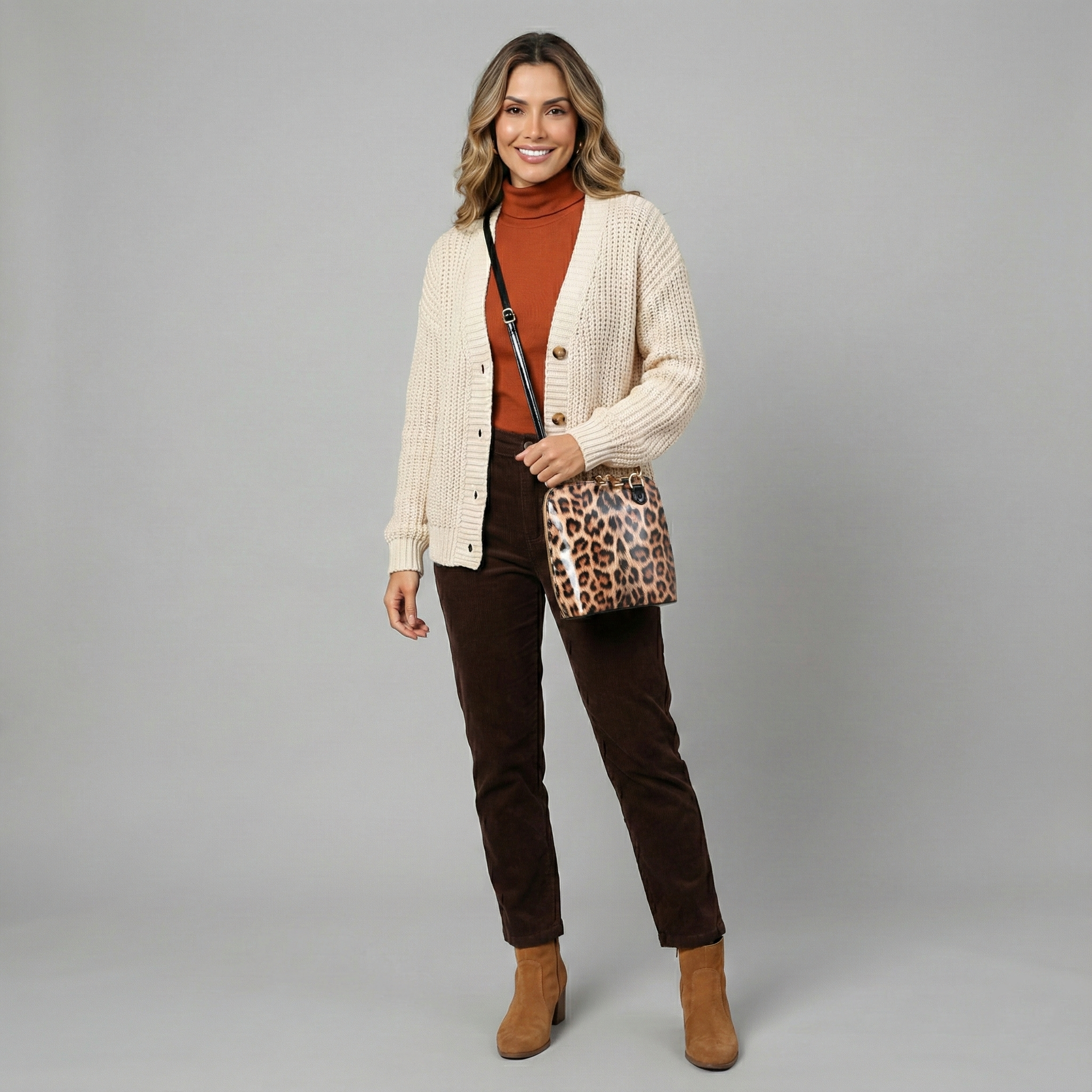 A compact leopard print crossbody built for everyday use. Light, structured, and easy to carry, it delivers that bold look without losing practicality.