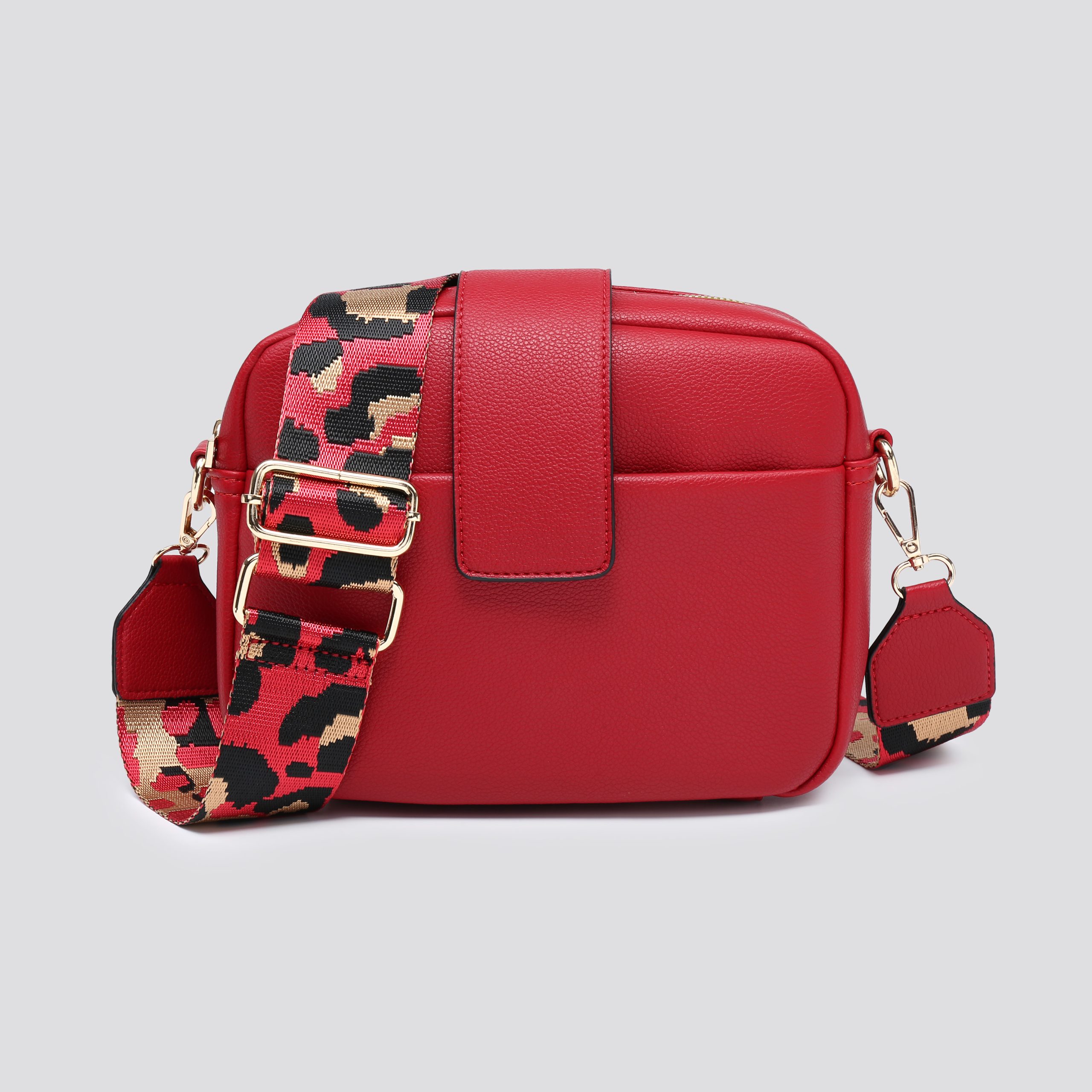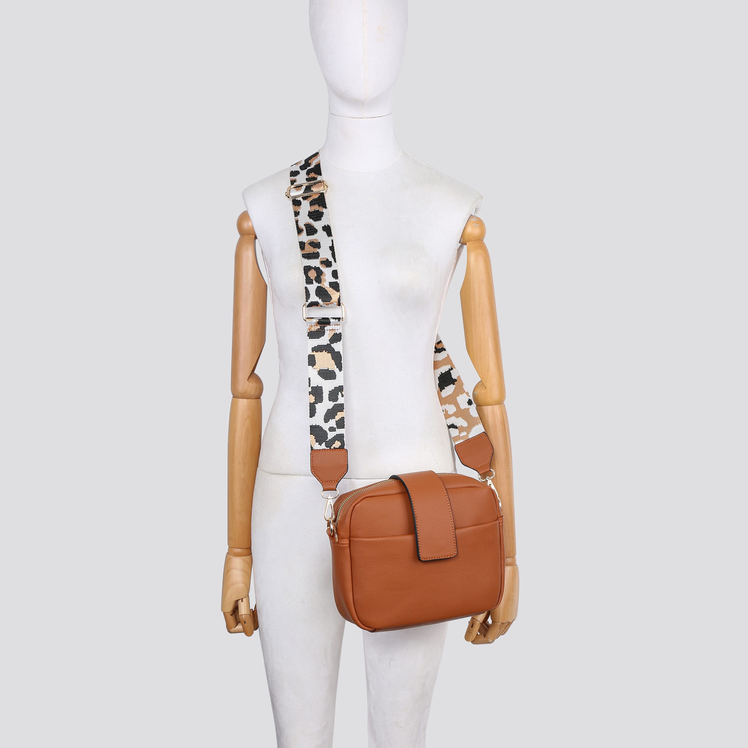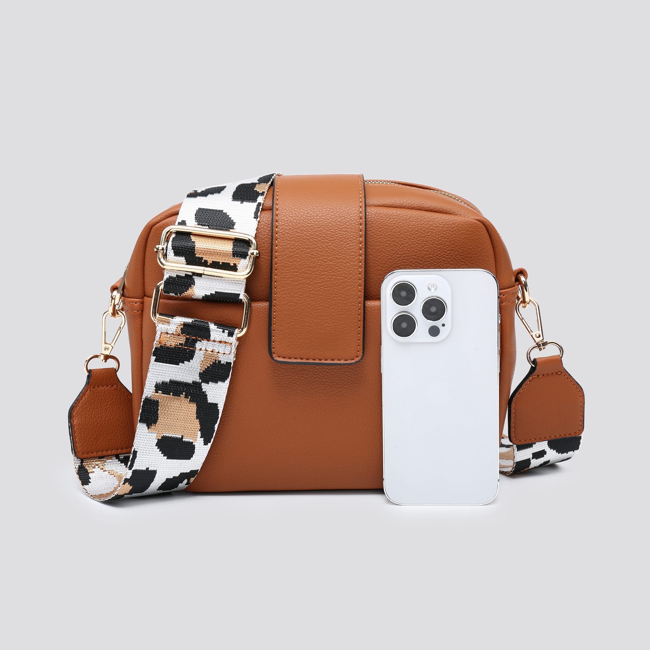 Unleash your wild side with this trendy faux leather crossbody bag. Defined by its statement leopard print “guitar-style” strap, this boxy camera bag adds a bold, fashion-forward edge to a classic everyday silhouette.