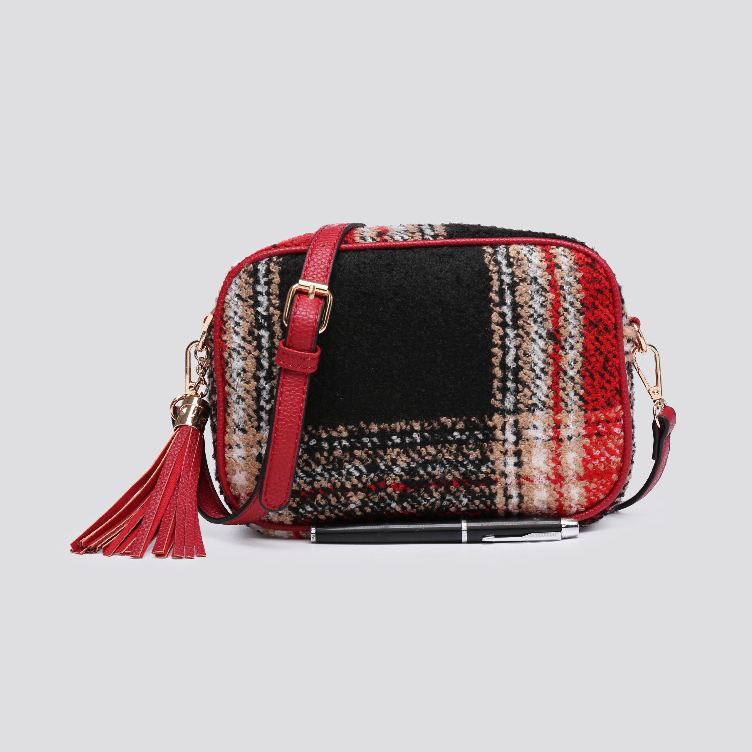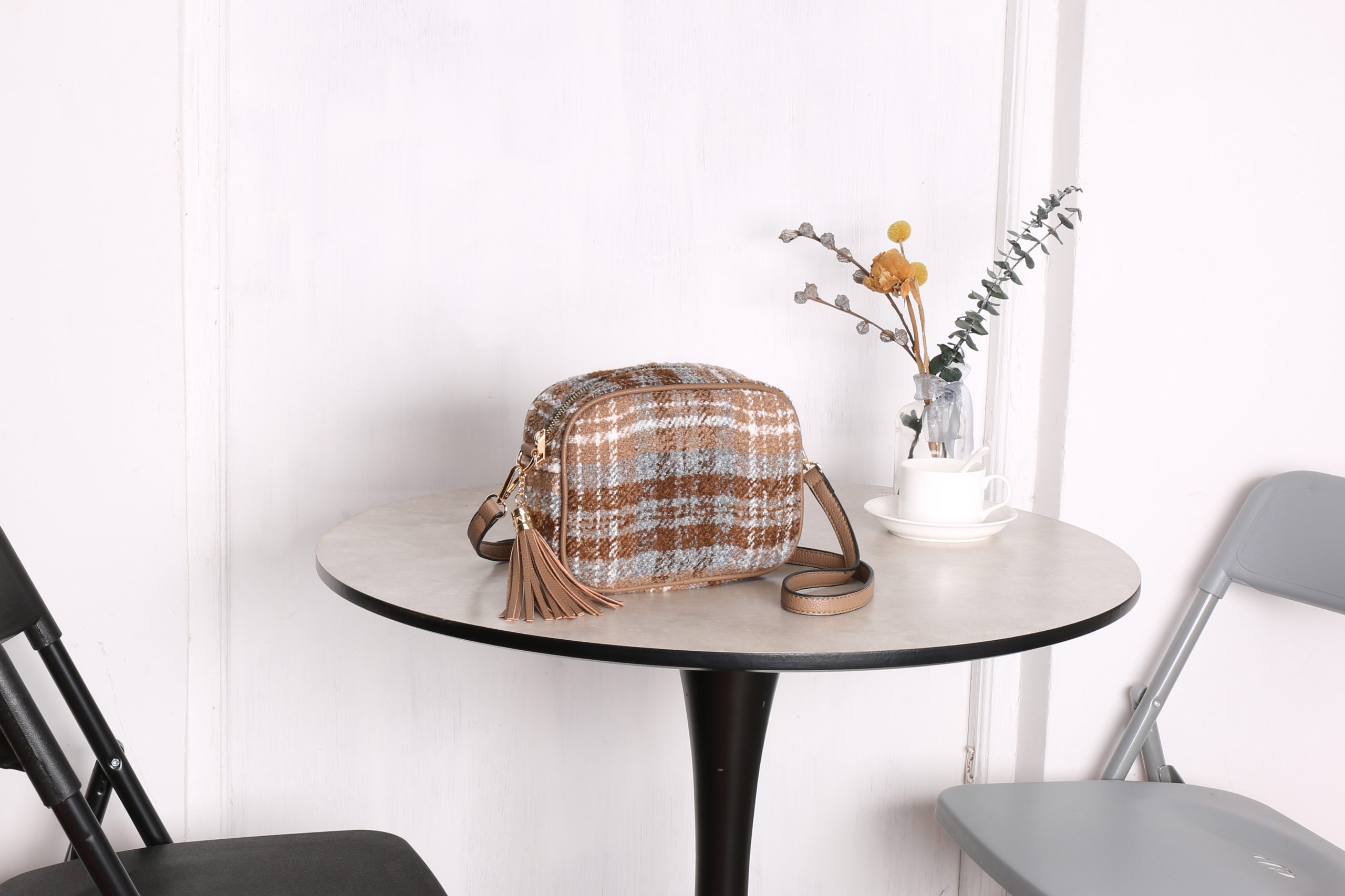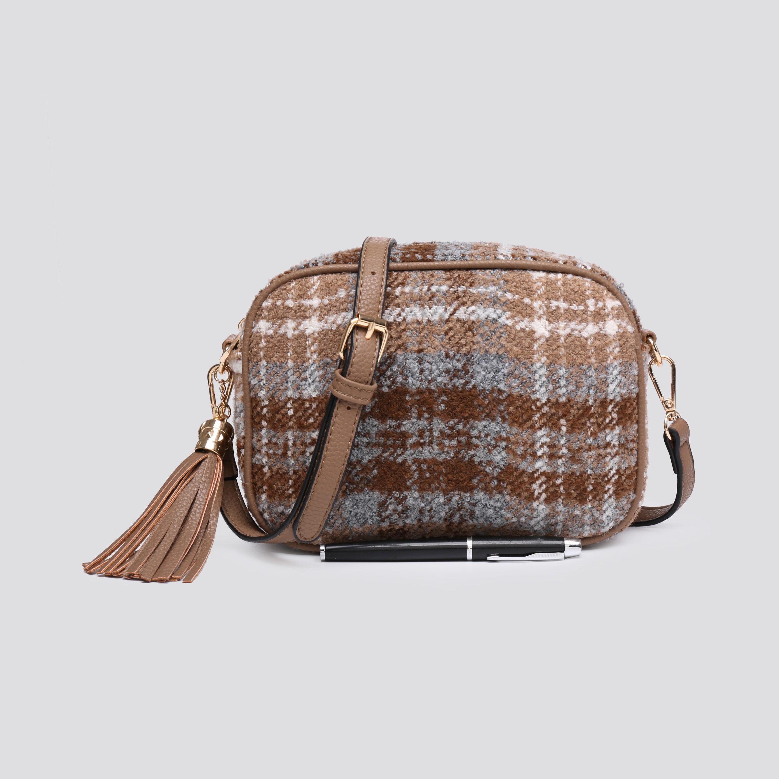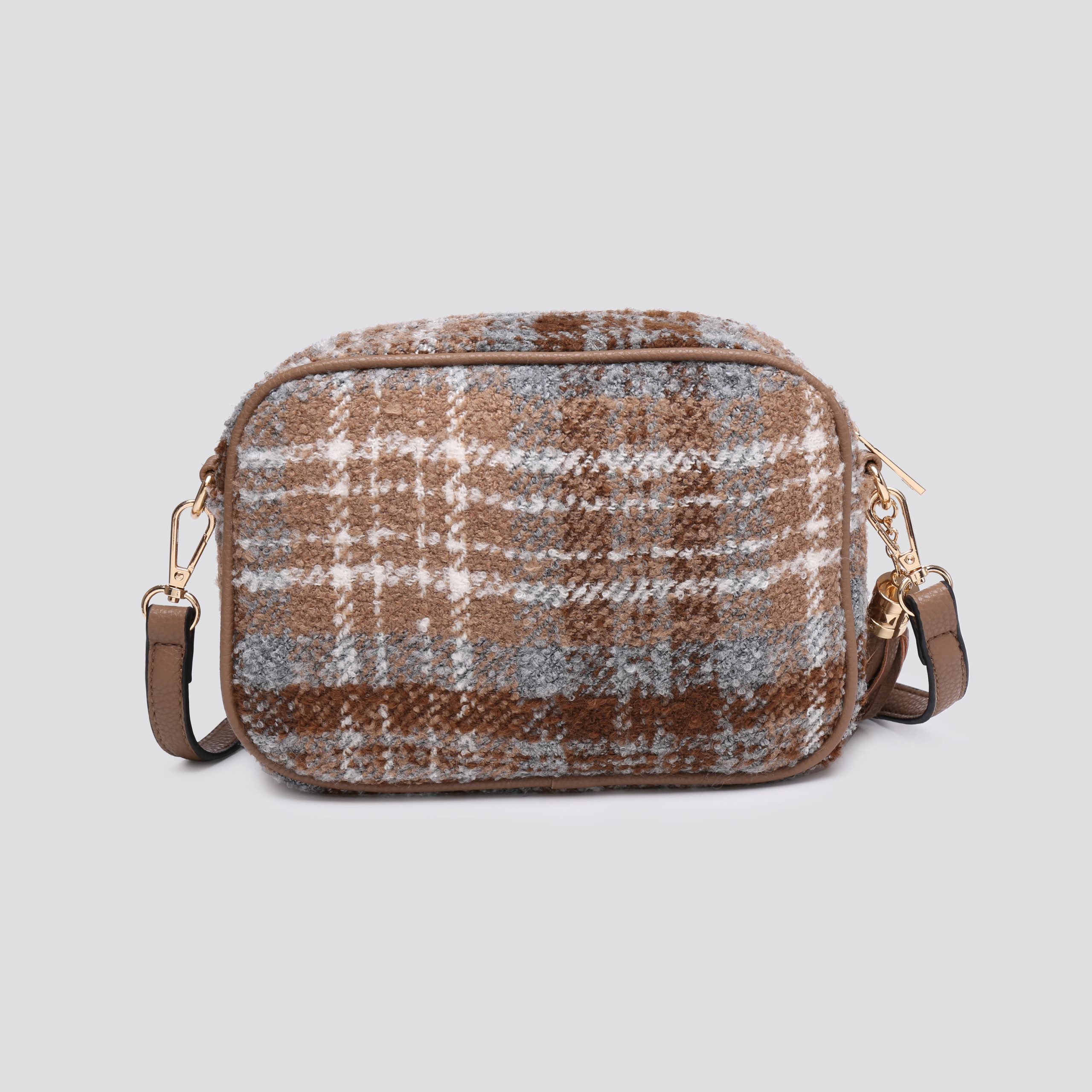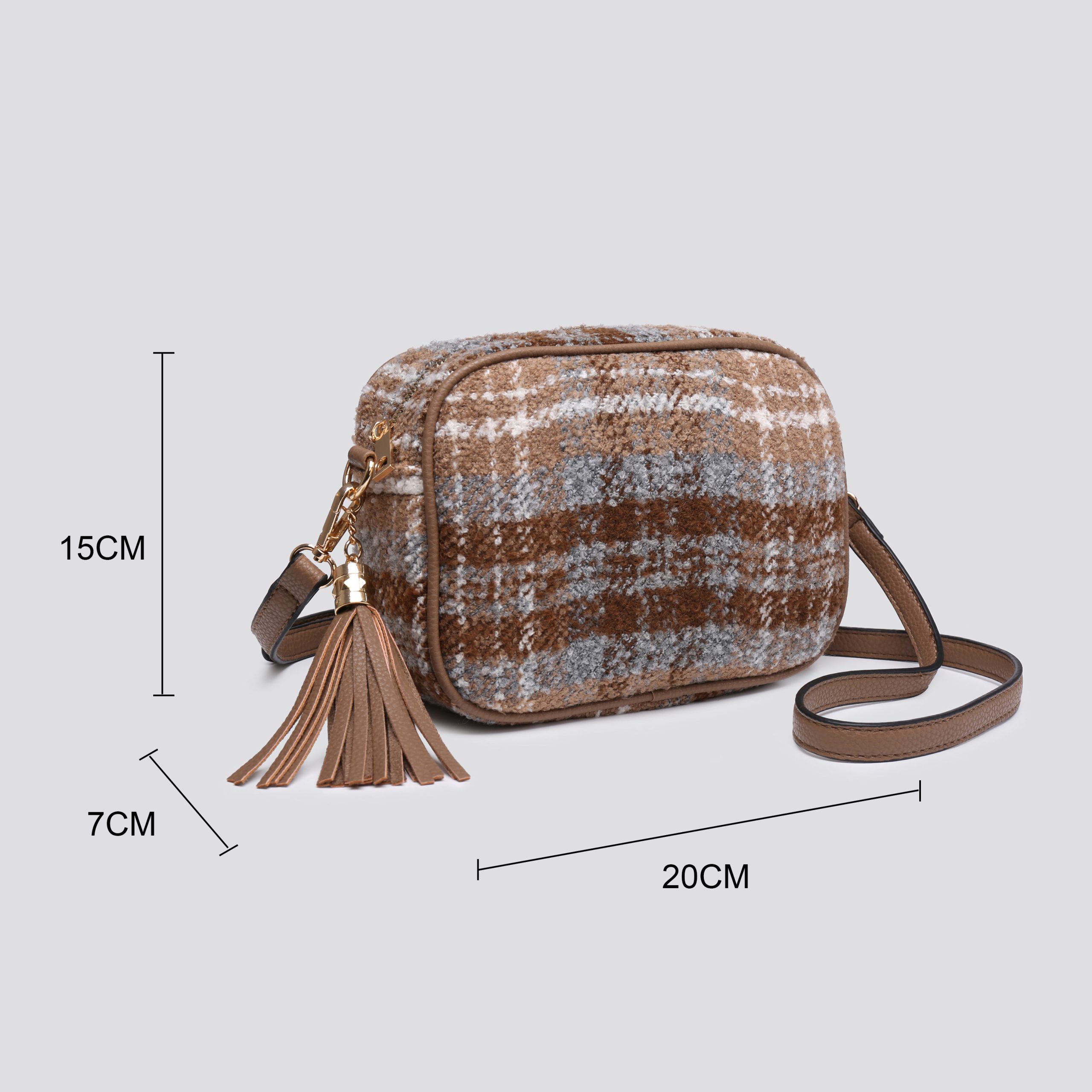 Embrace the cozy vibes of the season with this charming tartan camera bag. Featuring a classic check pattern in a soft, textured fabric, this compact crossbody brings a touch of heritage style and warmth to your daily wardrobe.