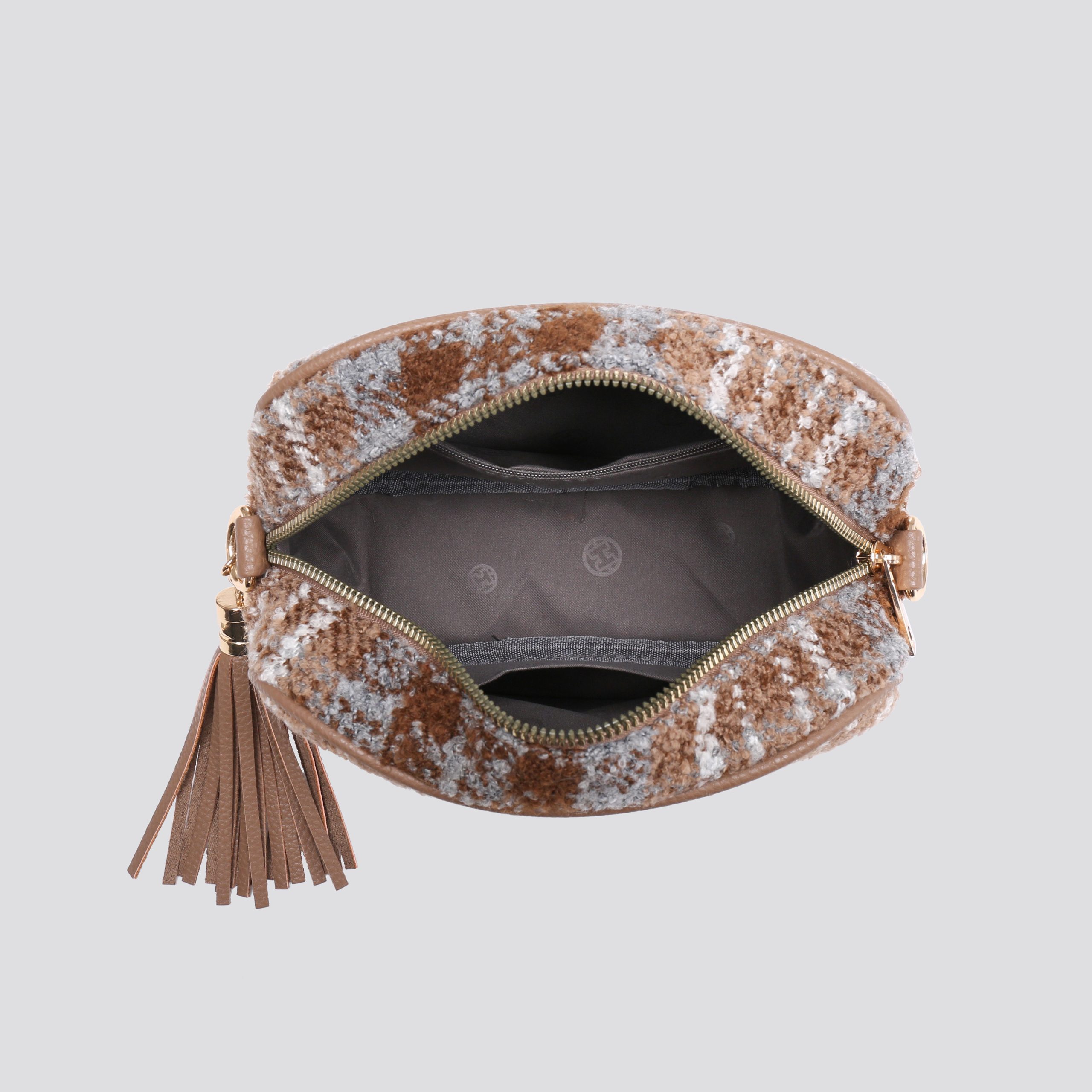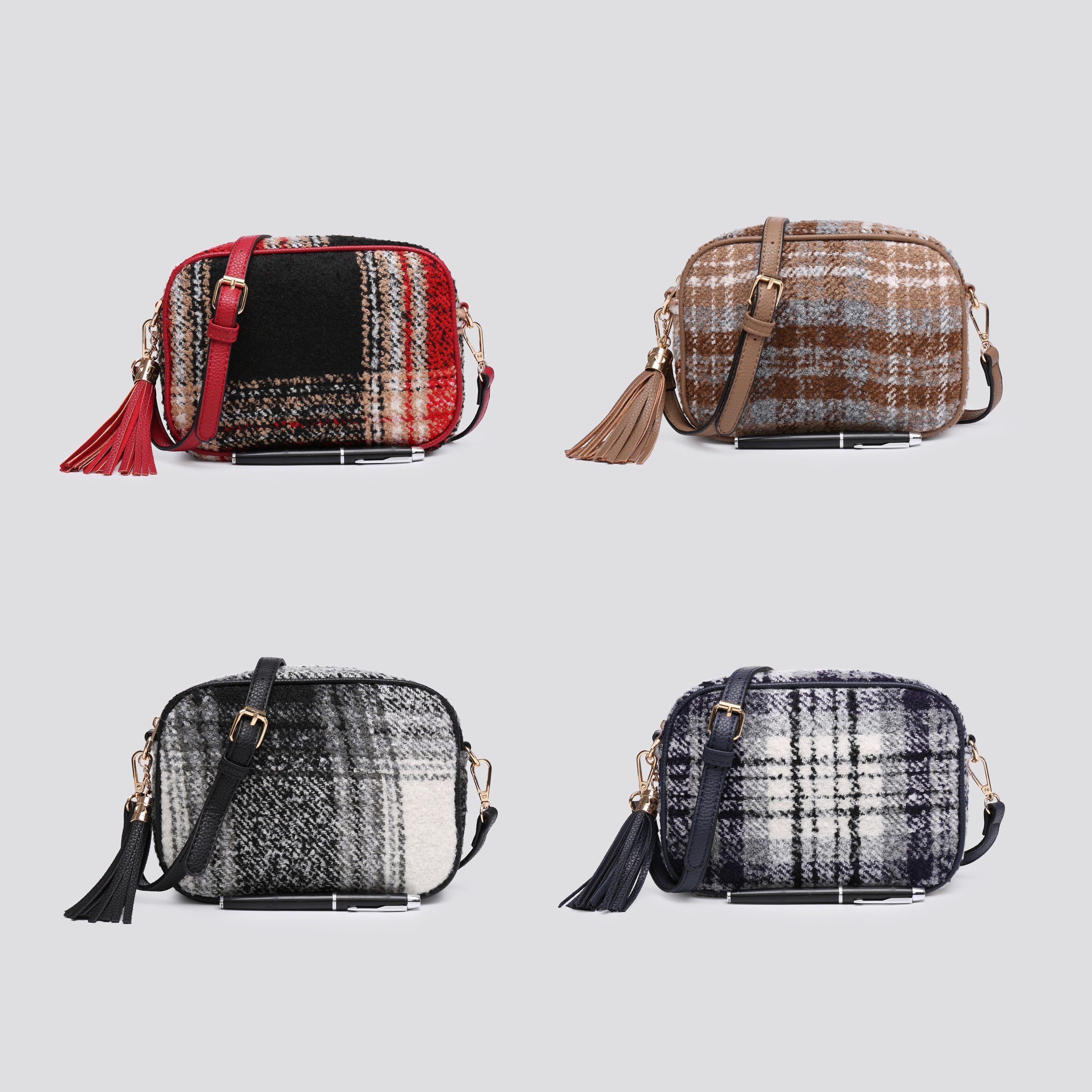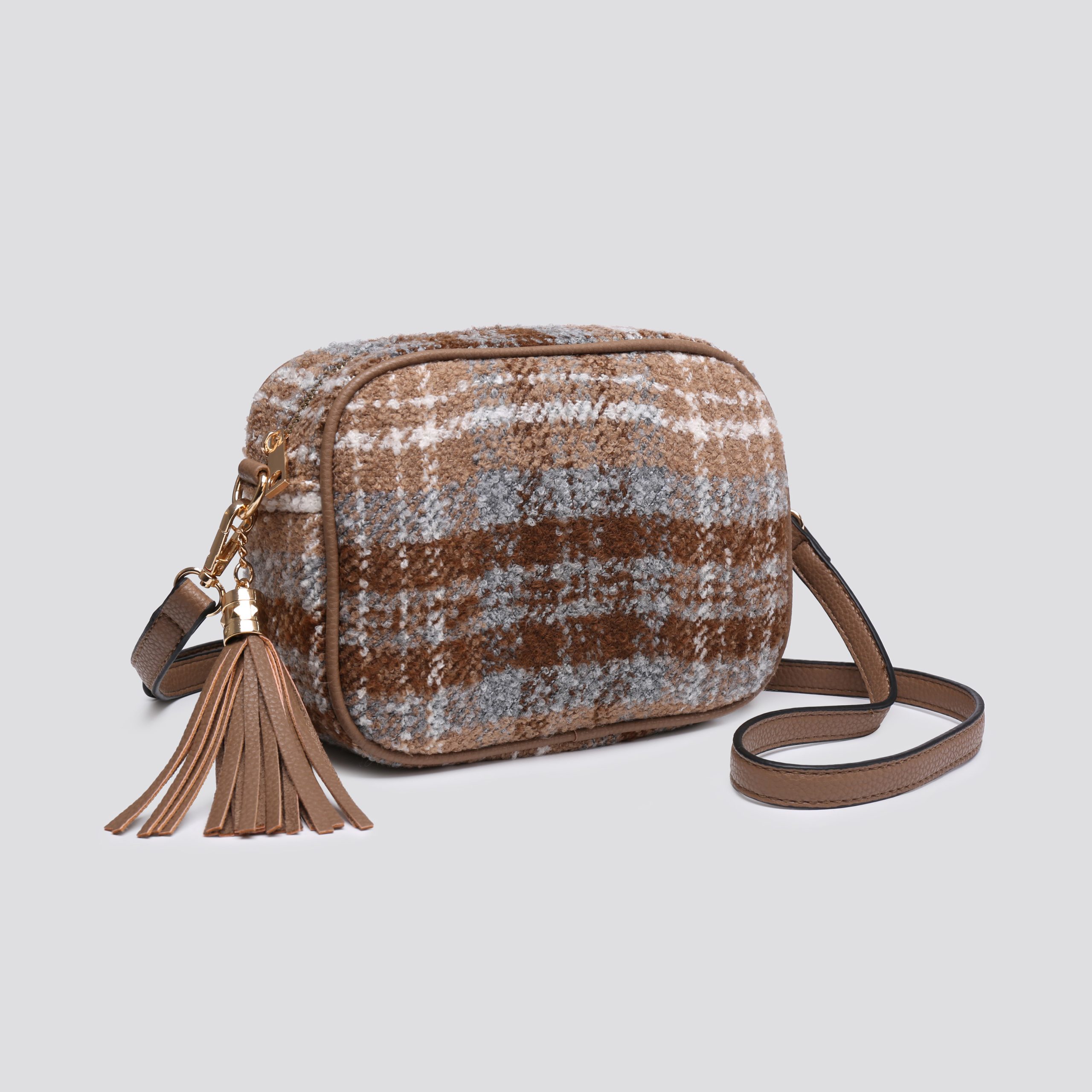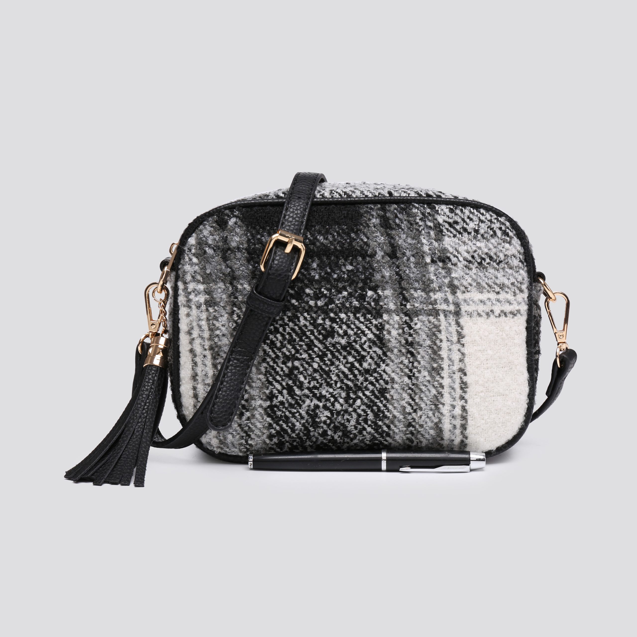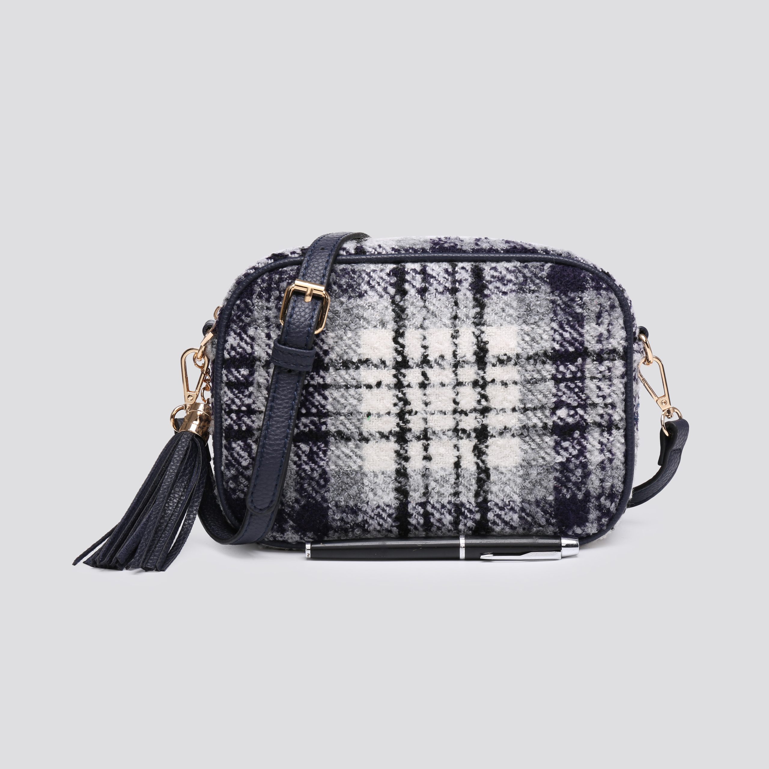 Embrace the cozy vibes of the season with this charming tartan camera bag. Featuring a classic check pattern in a soft, textured fabric, this compact crossbody brings a touch of heritage style and warmth to your daily wardrobe.