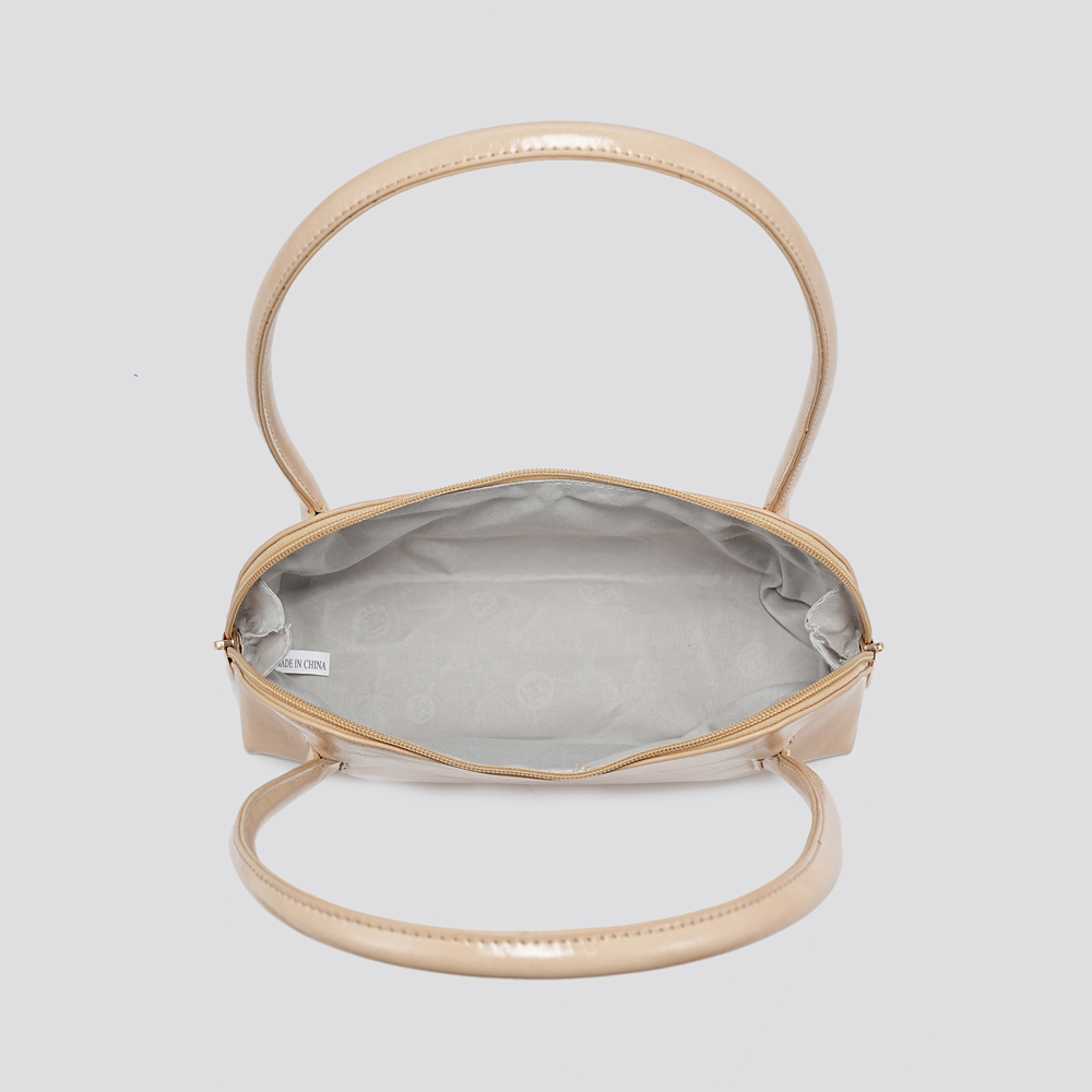 Features a streamlined “baguette” style shape with a secure top dual-zipper closure. The interior is lined in a soft grey fabric, providing a clean and organized space for your essentials. Finished with sleek, gold-tone zipper pulls for a touch of refined luxury.