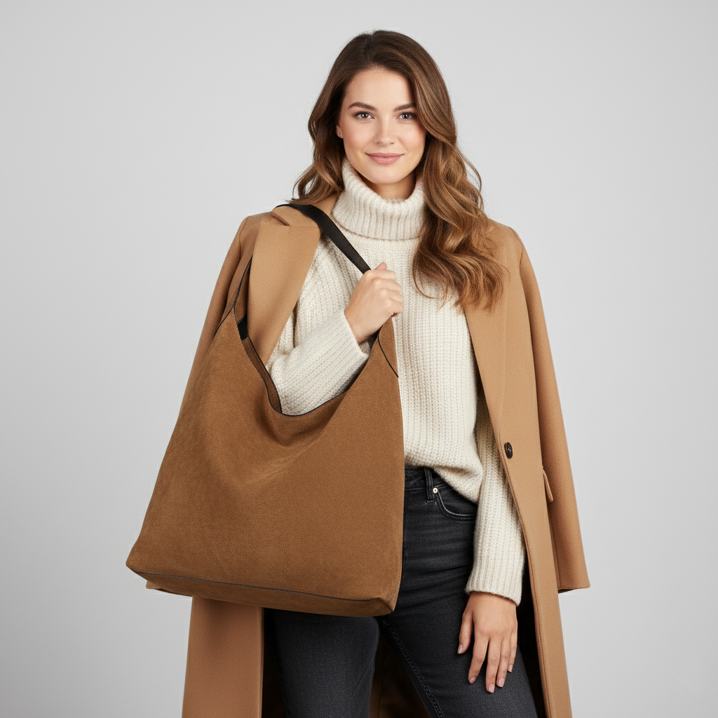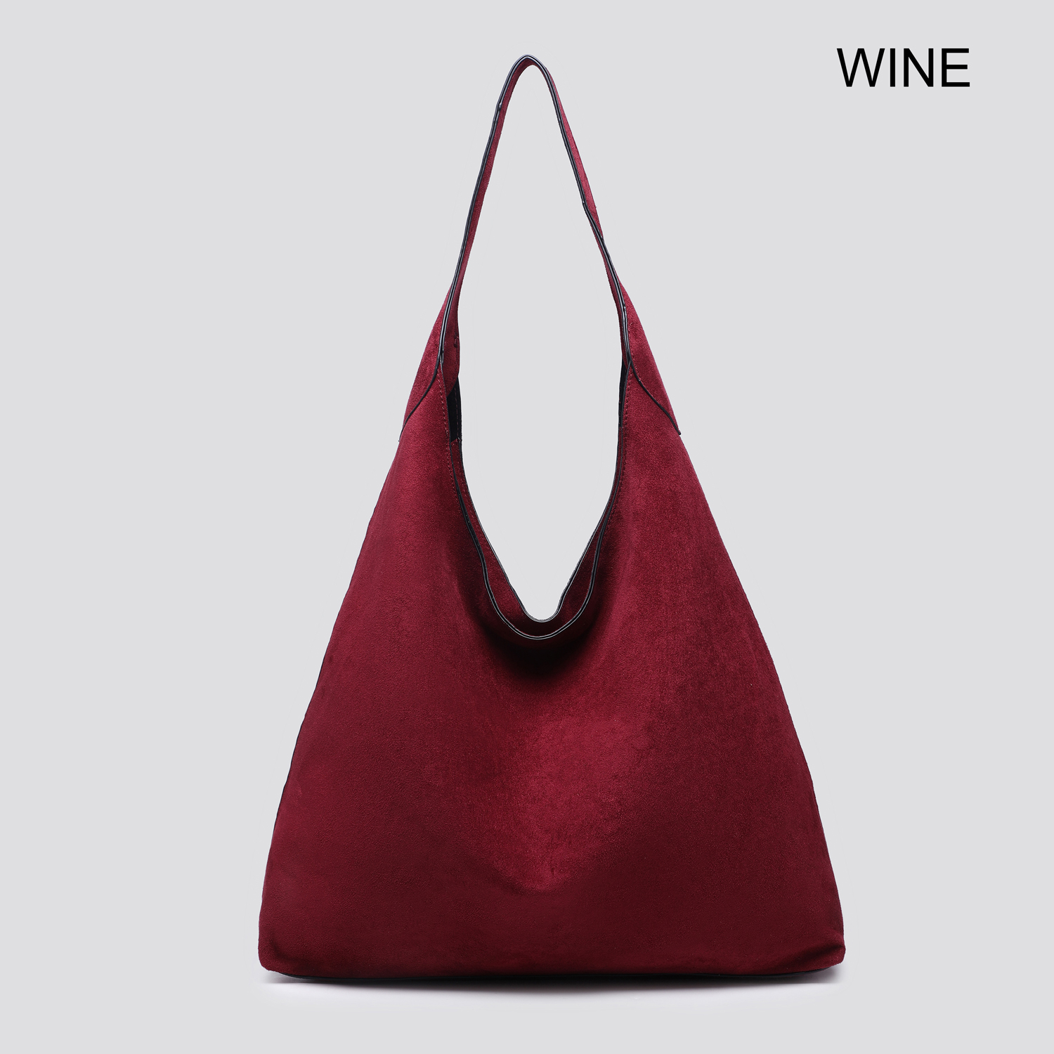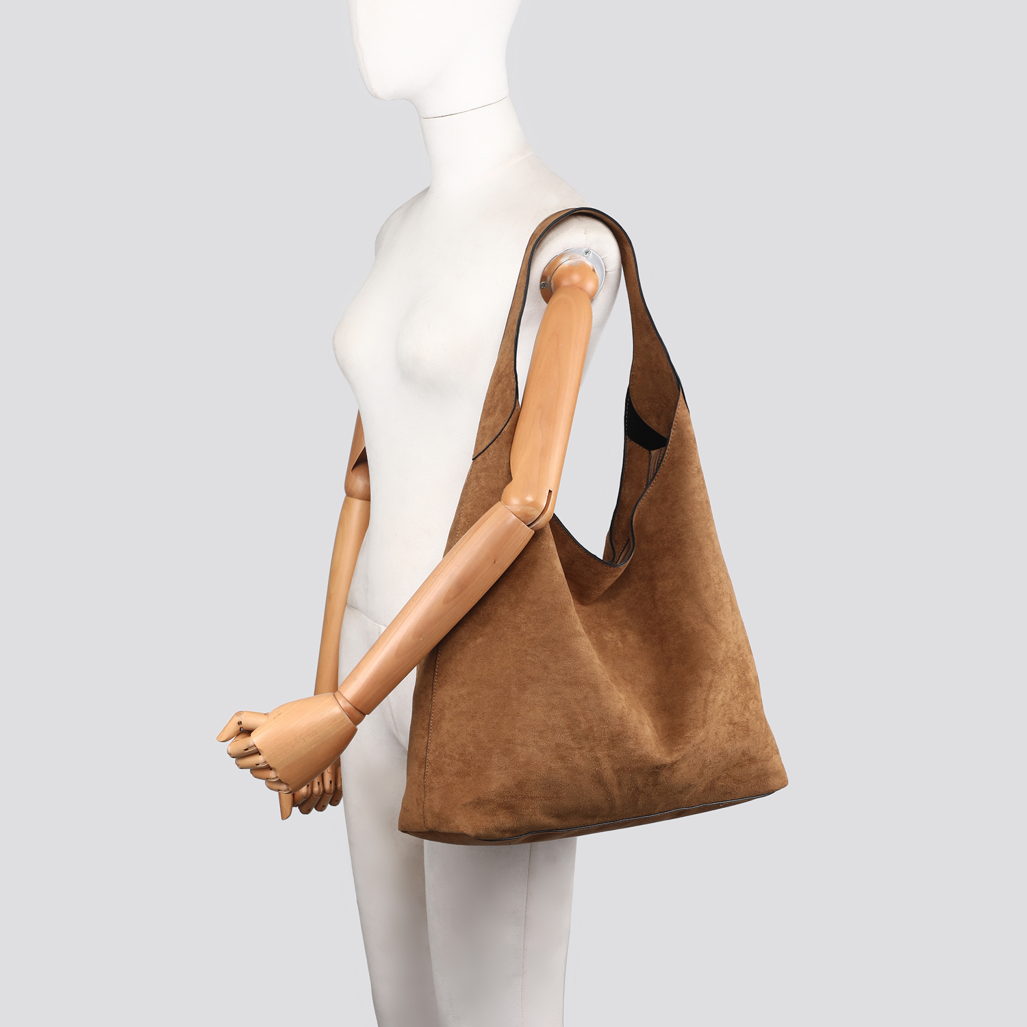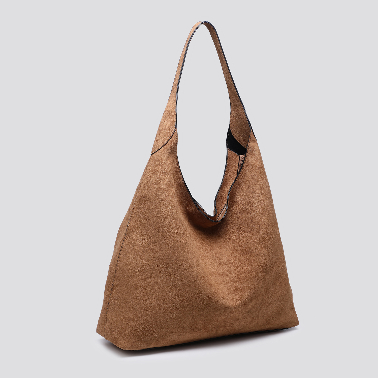 A soft, faux suede slouch hobo bag with a relaxed silhouette and smooth texture. It carries that easy, throw-on feel while keeping a touch of elegance in its design. The roomy structure makes it ideal for daily use while staying effortlessly chic.