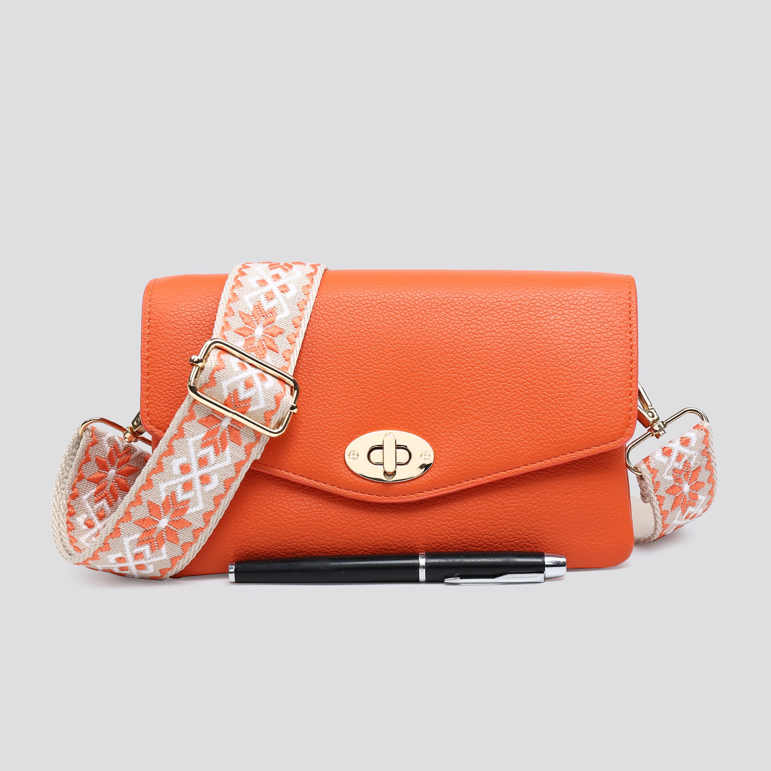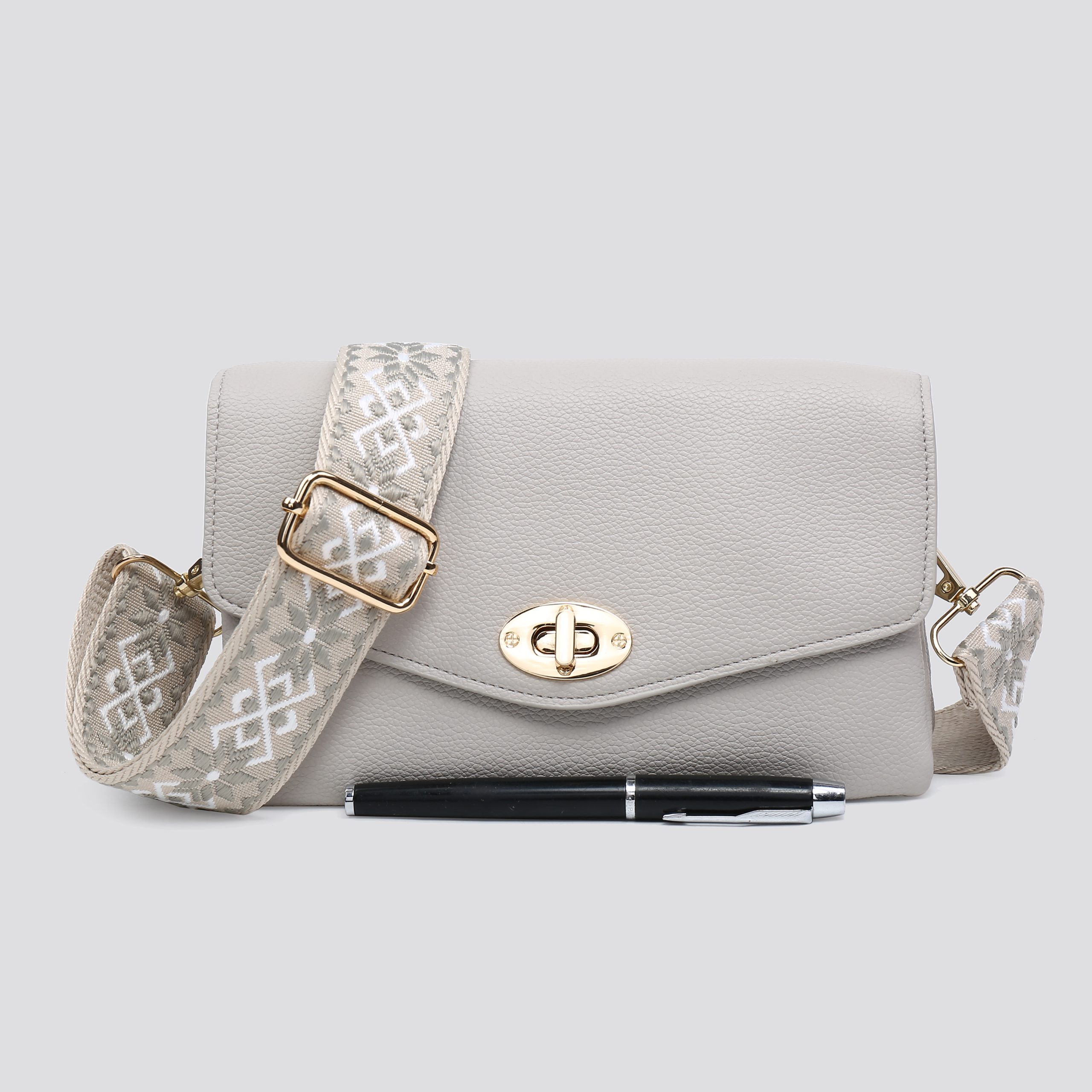 Two separate zip compartments, fabric-lined interior with slip pockets, metallic twist-lock flap, metallic hardware throughout, wide patterned webbing strap.