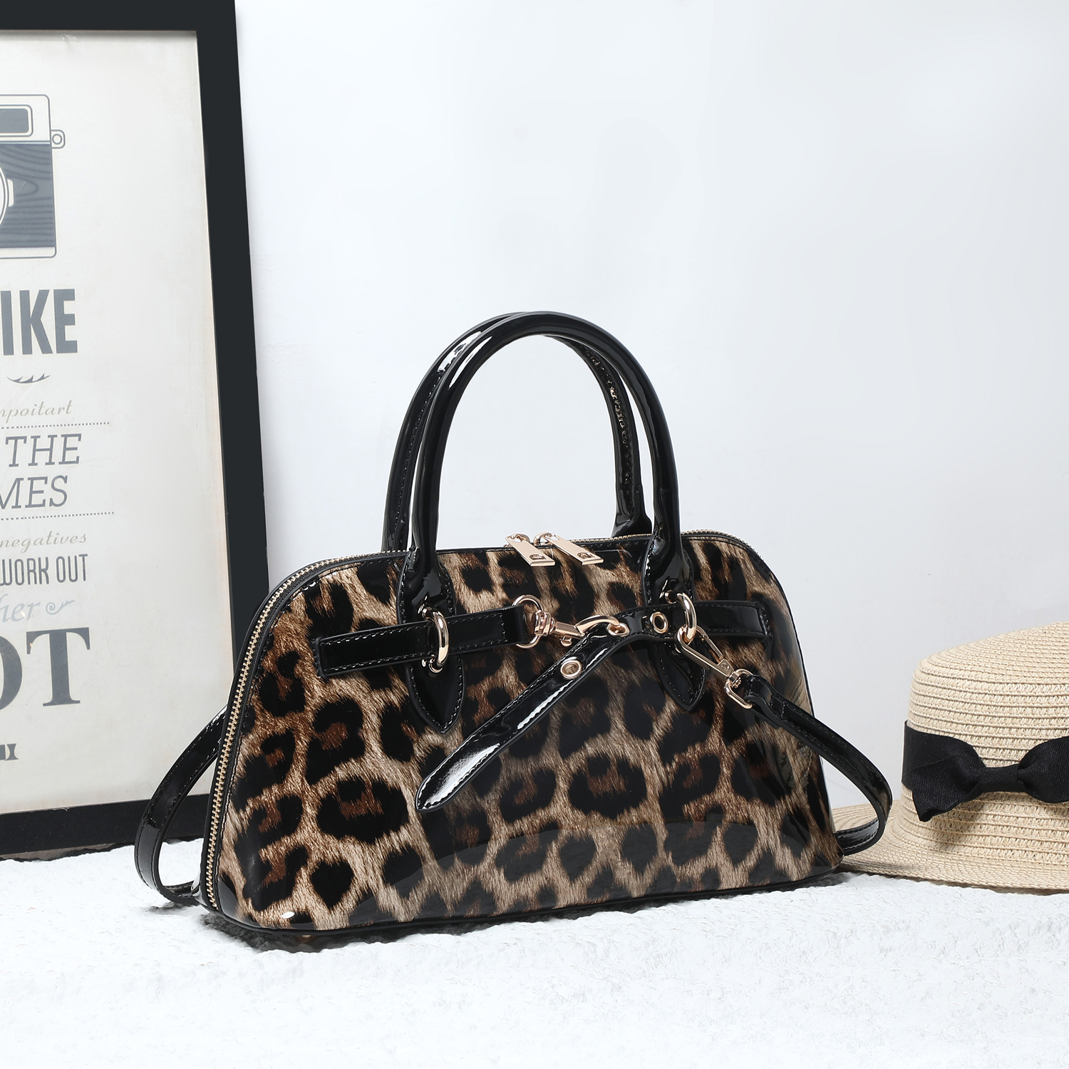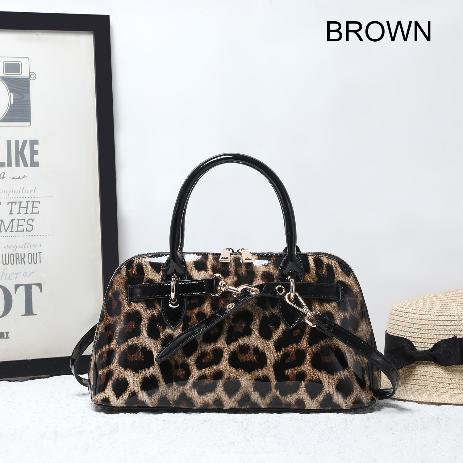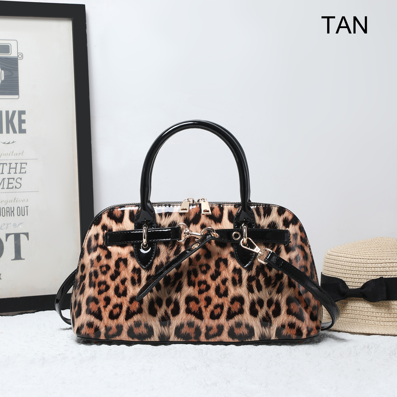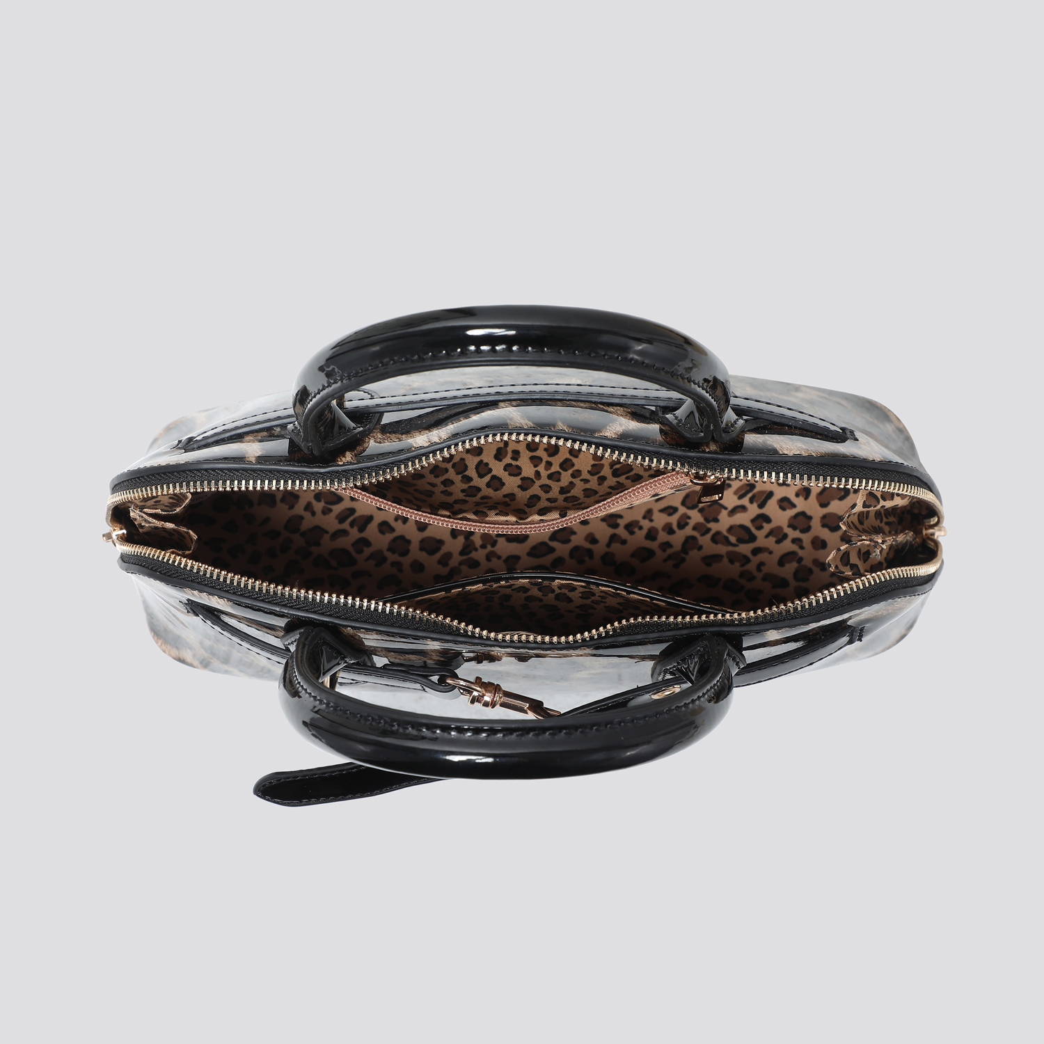 Designed with dual top handles and a detachable, adjustable shoulder strap for versatile carry options. The spacious interior includes a center zip compartment, side pockets, and a soft leopard-print lining for a stylish touch inside and out.