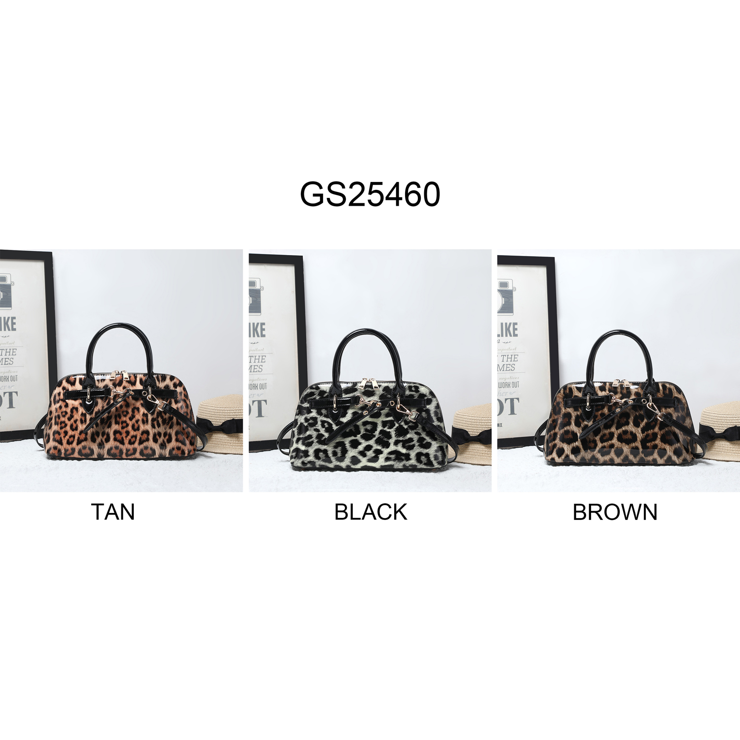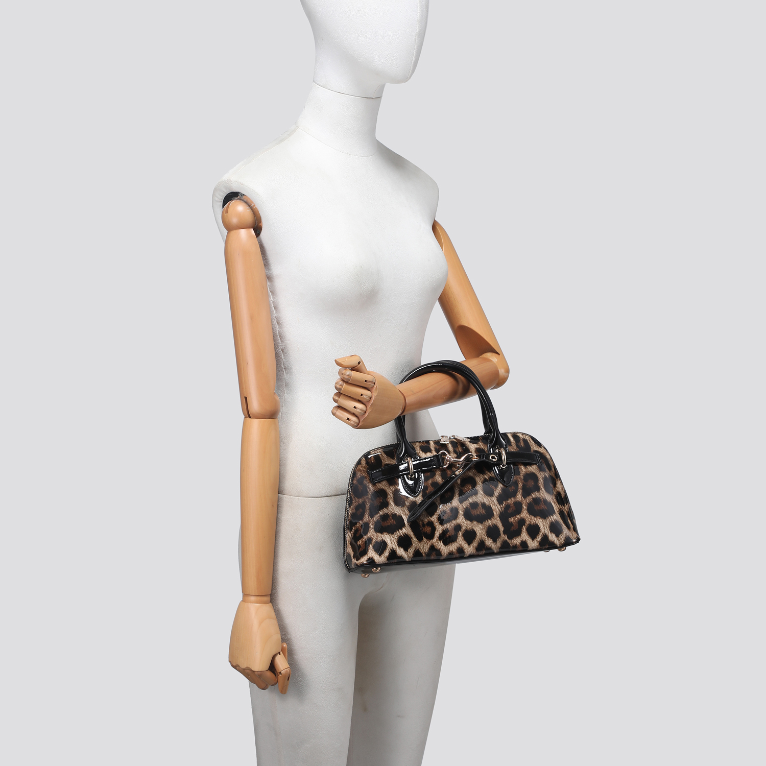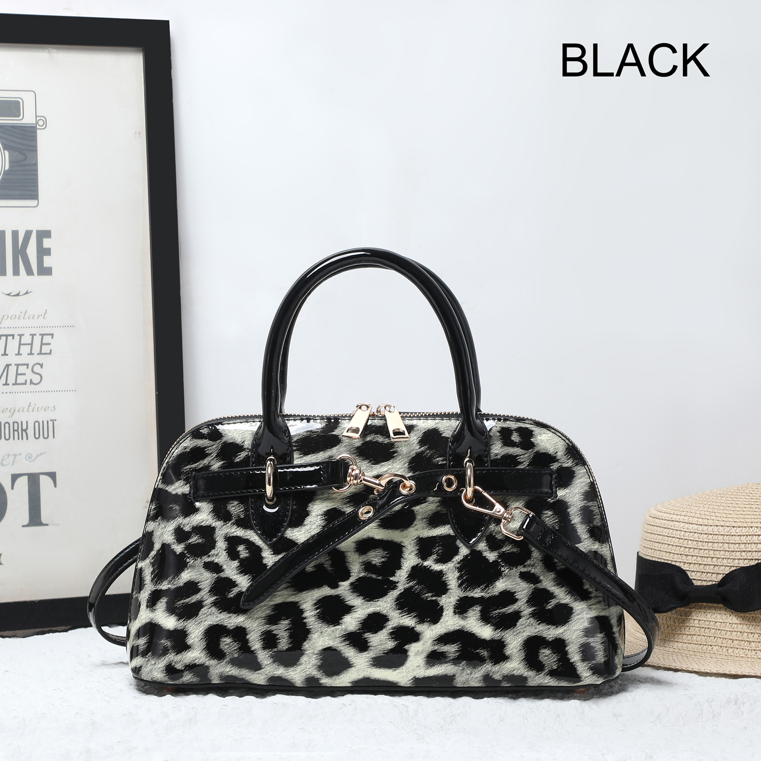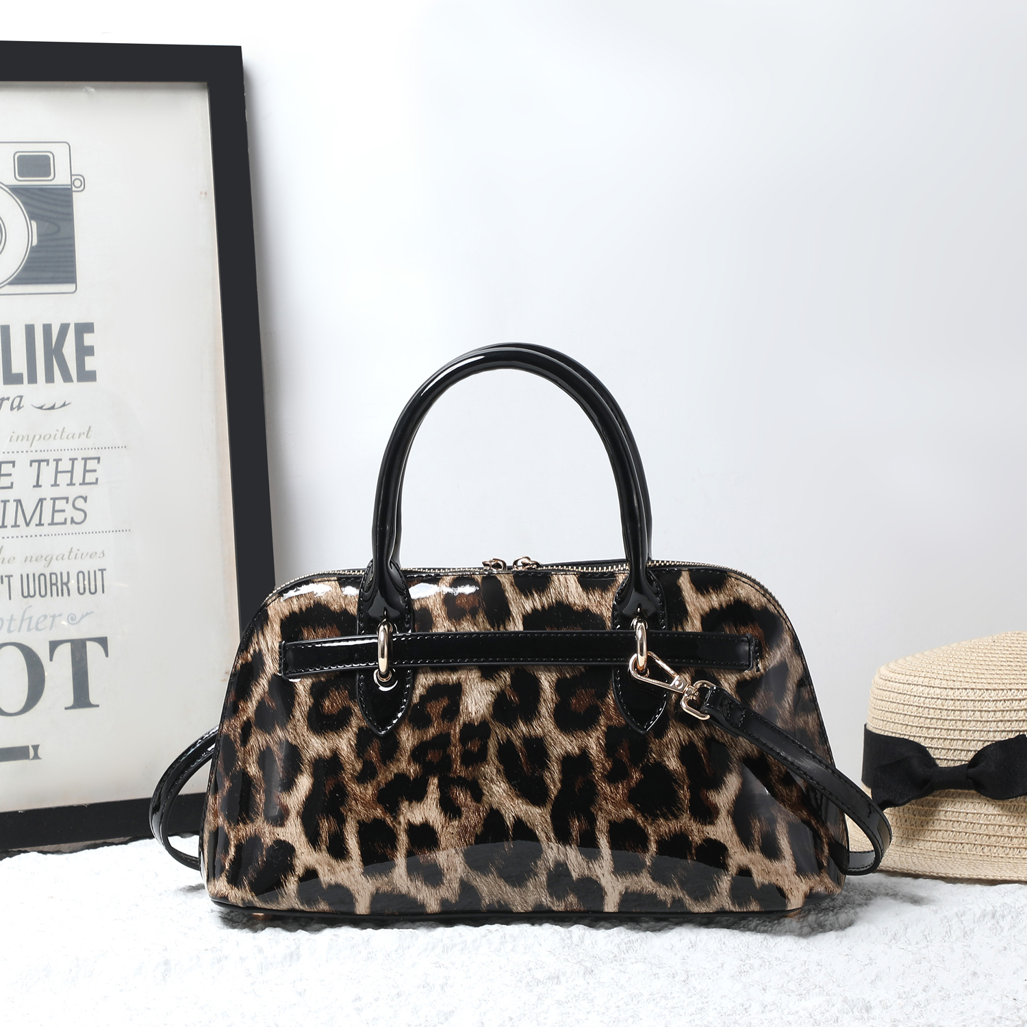 Designed with dual top handles and a detachable, adjustable shoulder strap for versatile carry options. The spacious interior includes a center zip compartment, side pockets, and a soft leopard-print lining for a stylish touch inside and out.