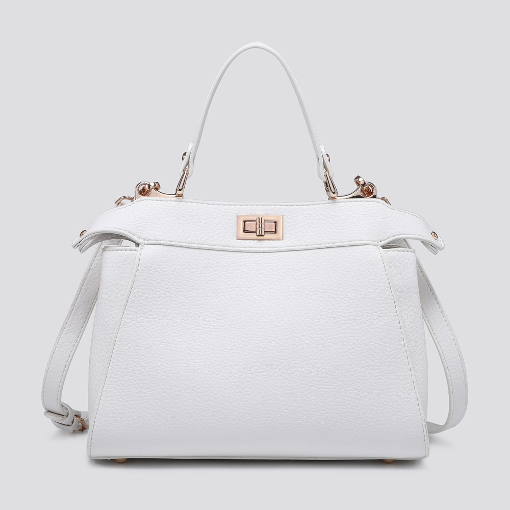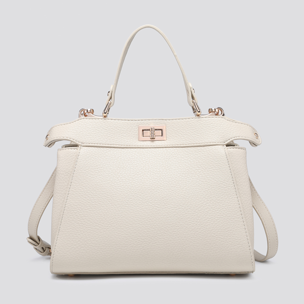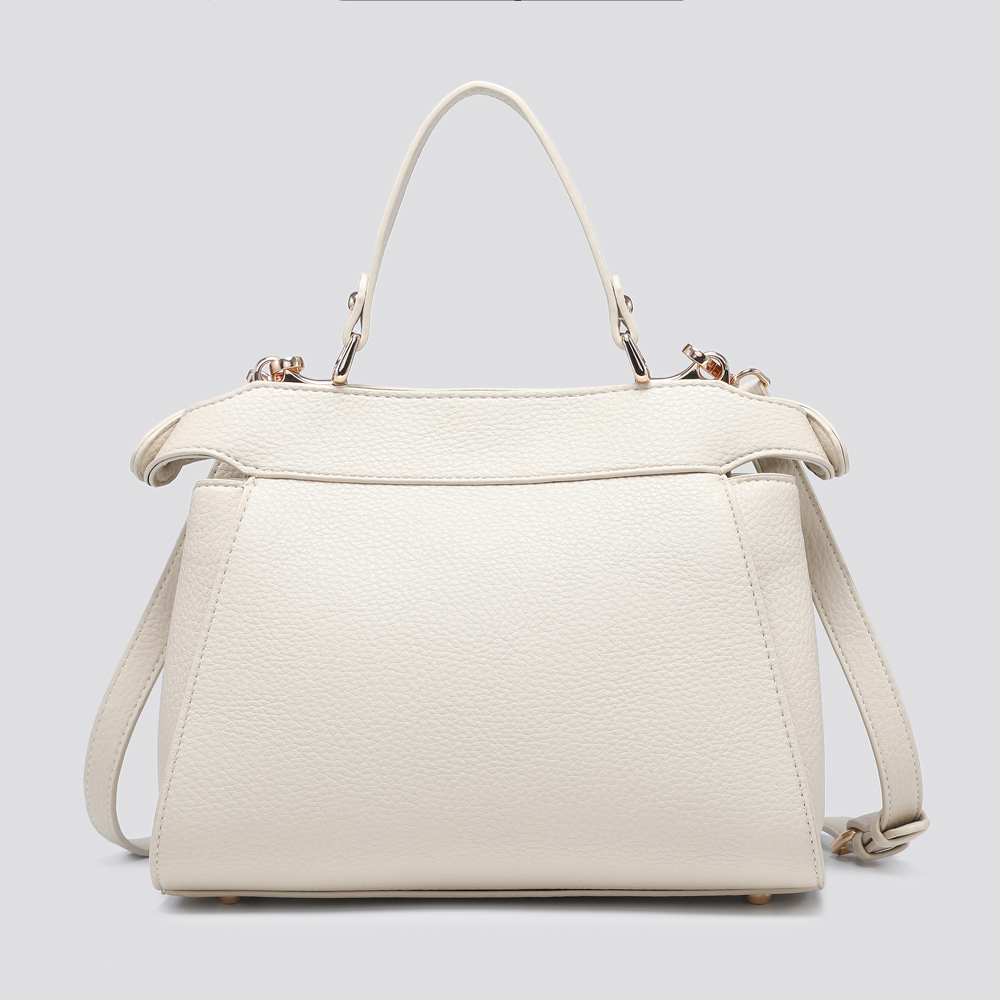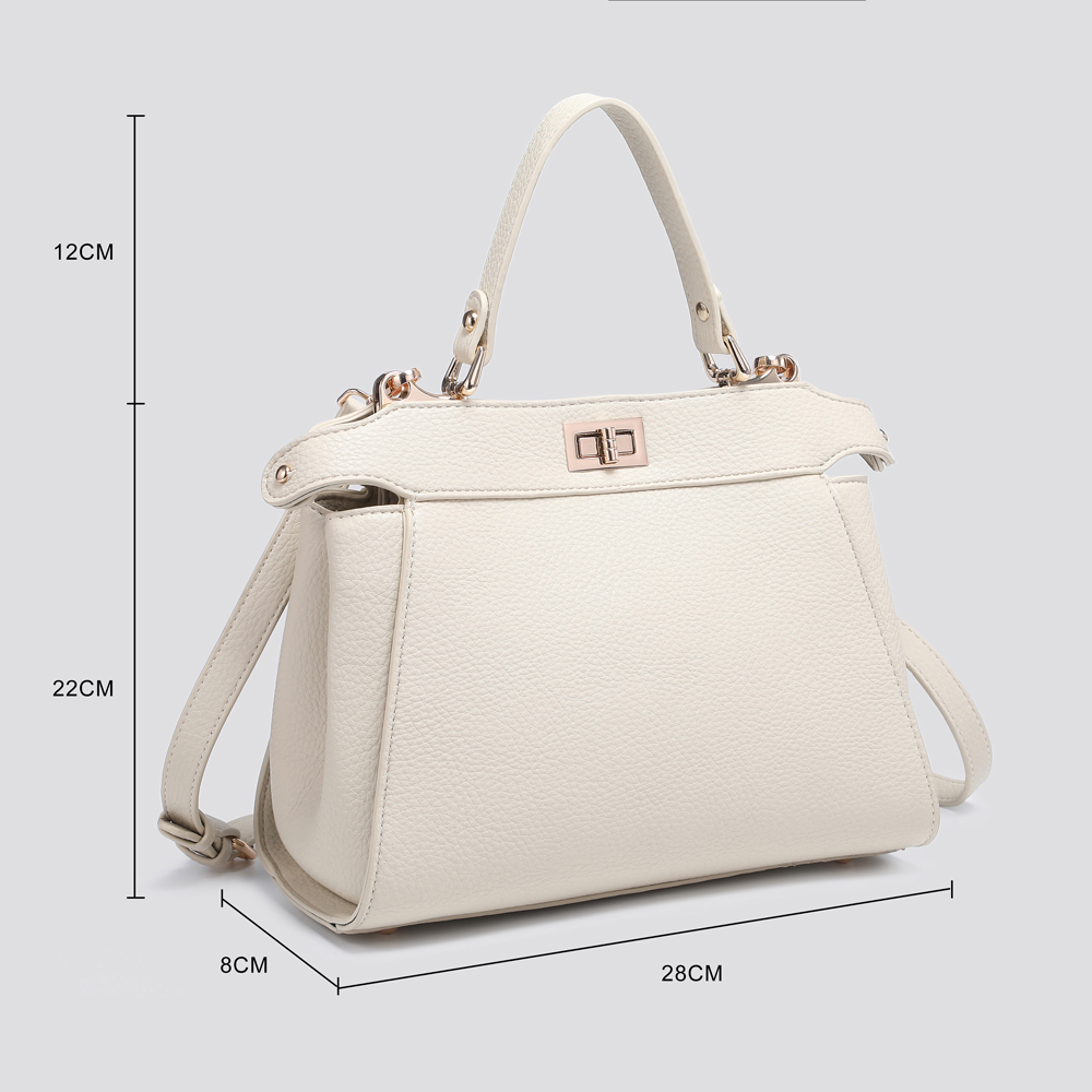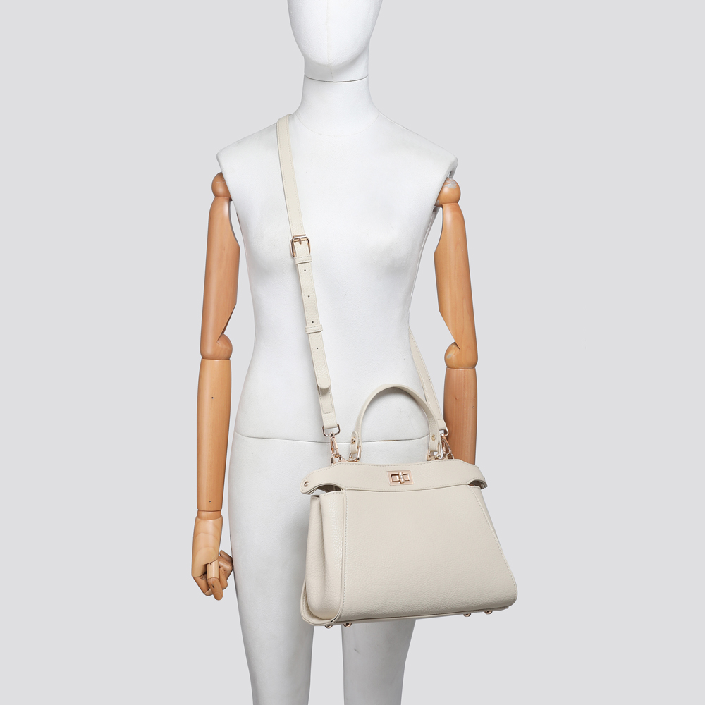 Exude timeless elegance with this structured cream handbag. Crafted from premium pebbled faux leather, its sophisticated trapezoidal silhouette and polished hardware details make it a luxurious addition to any wardrobe, perfect for those who appreciate understated luxury.