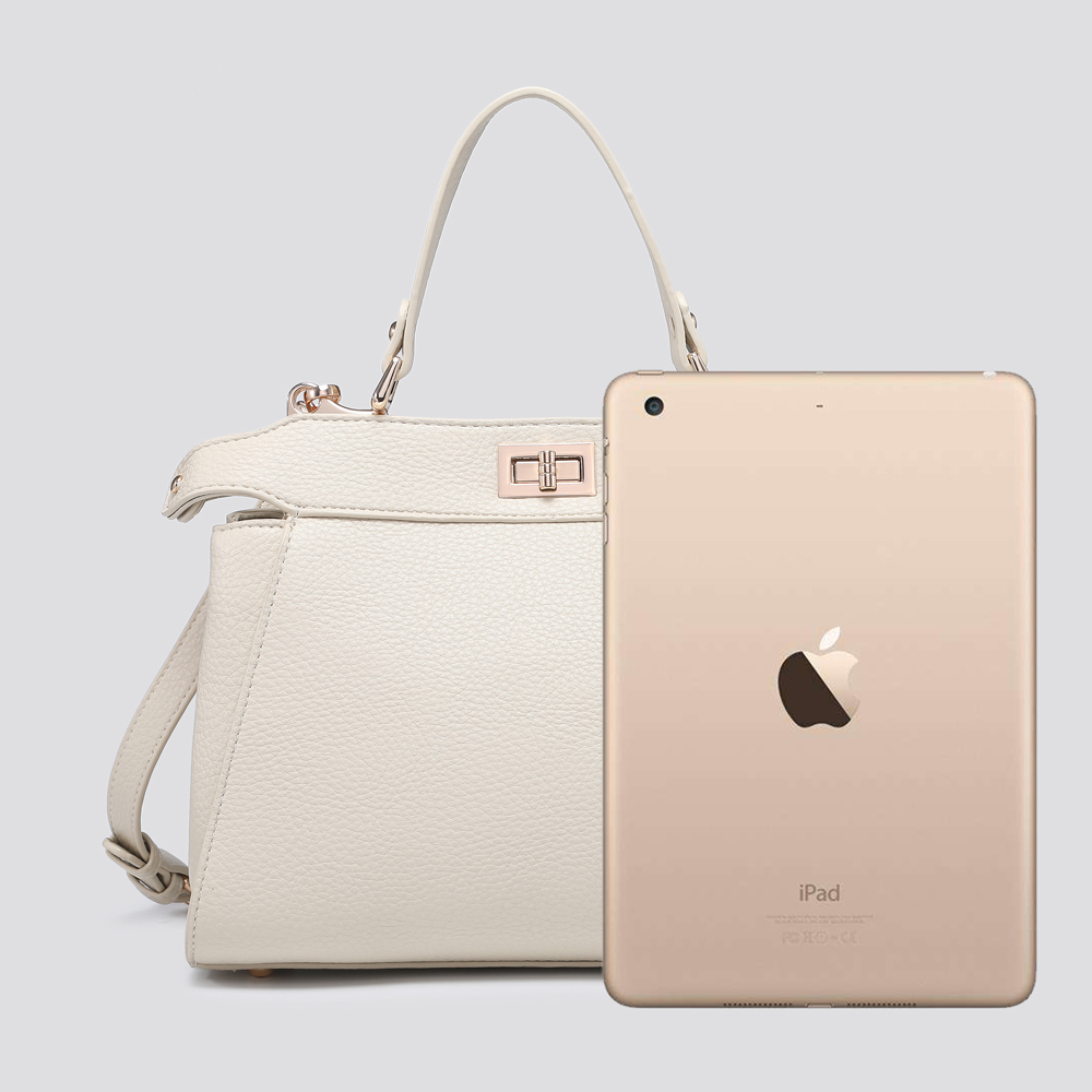 Wipe clean with a soft, damp cloth to remove dust or light stains. Avoid harsh chemicals. Store in a dust bag and keep away from direct sunlight to preserve the cream color and hardware shine.