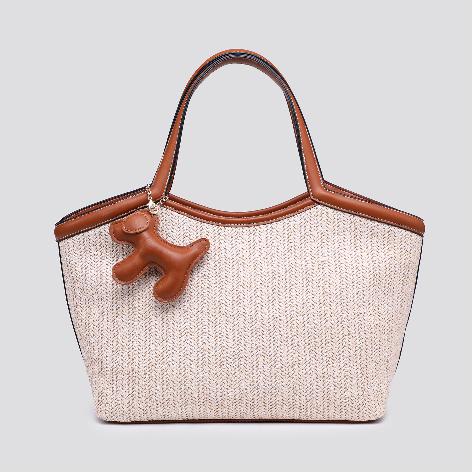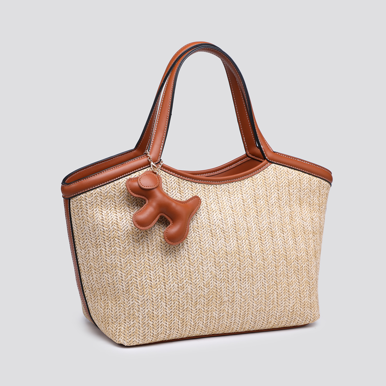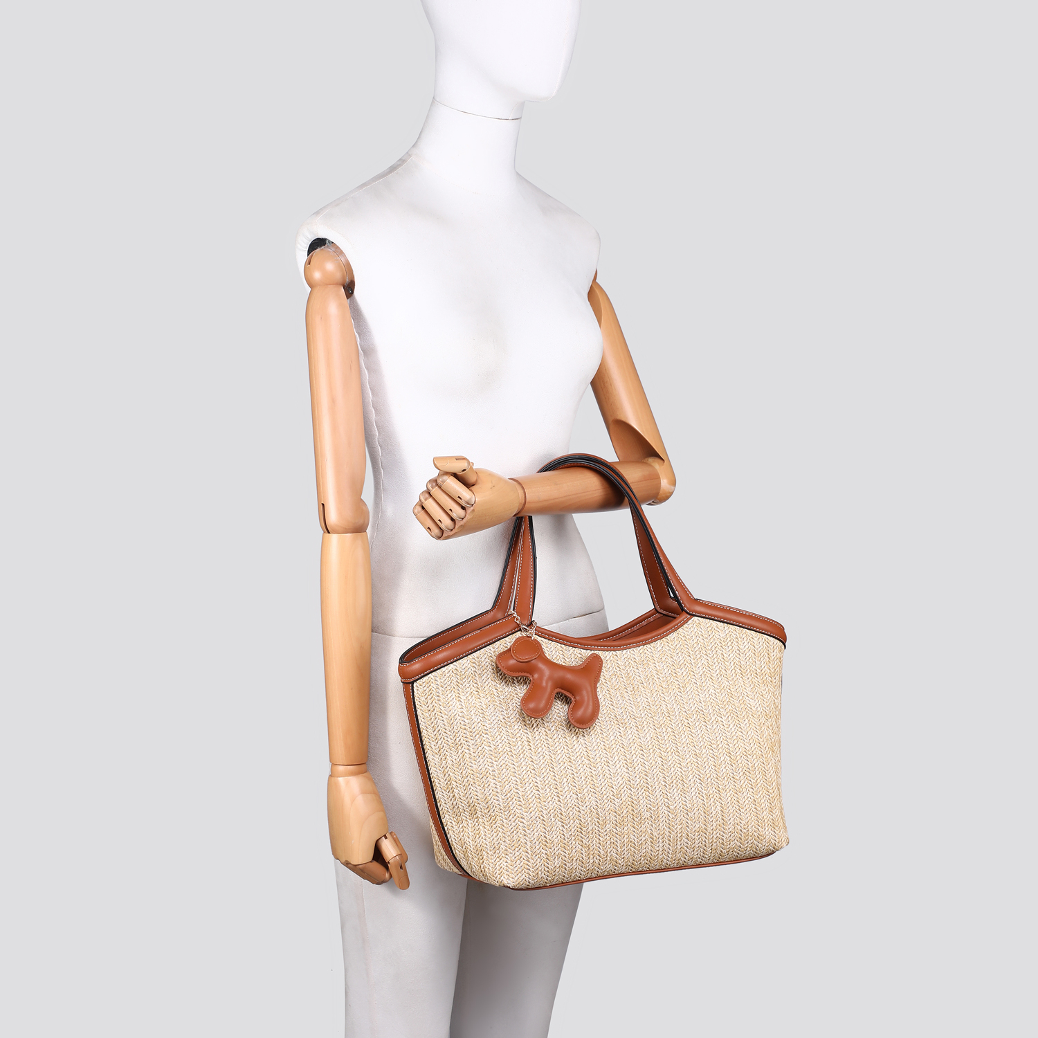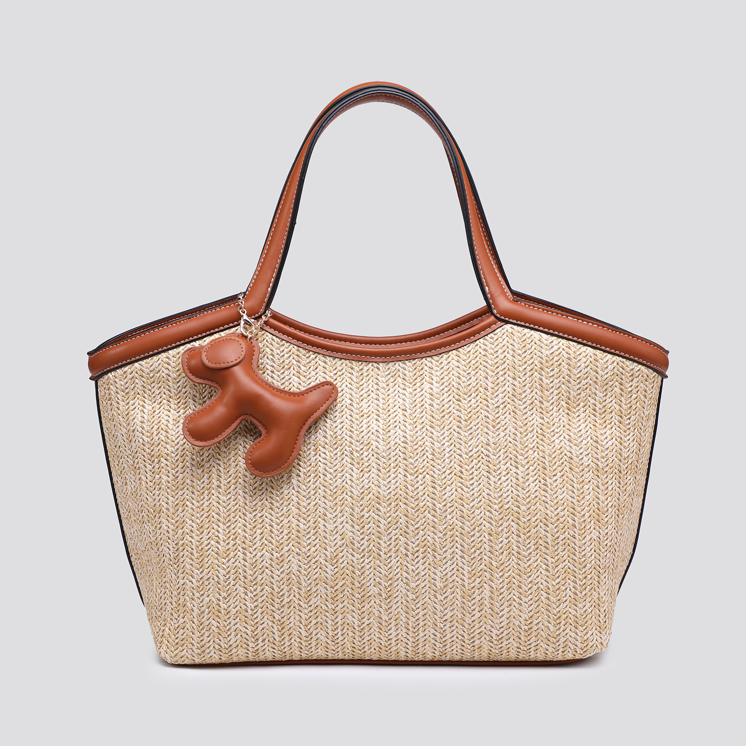 Capture the carefree essence of sunny days with this effortlessly chic woven tote. The textured exterior features an intricate herringbone pattern that elevates the rustic charm, while the smooth, curved trim adds a layer of structured sophistication. Finished with a whimsical, puffy bag charm, this accessory balances playful personality with refined style, making it a standout piece for your warm-weather rotation.
