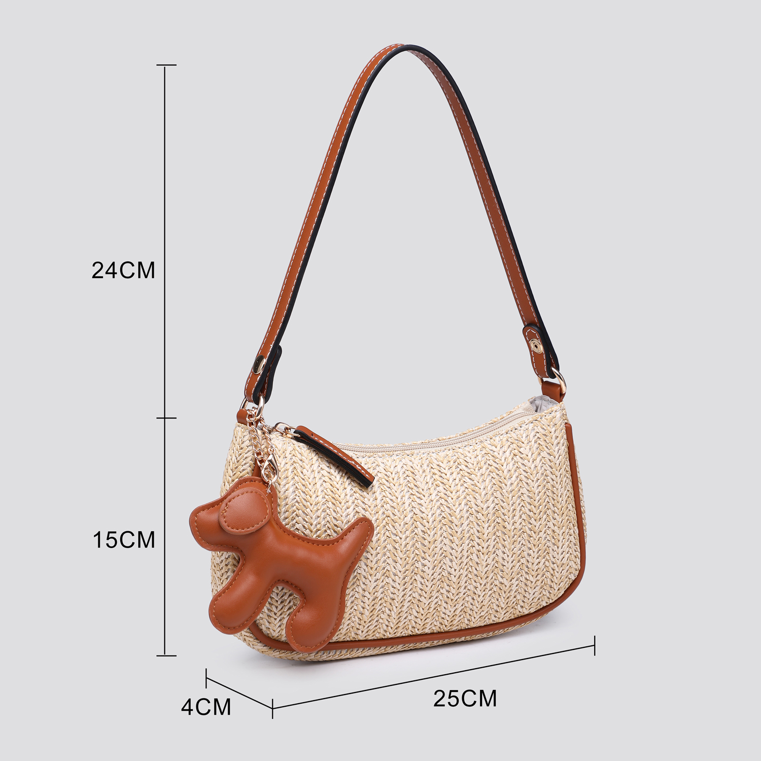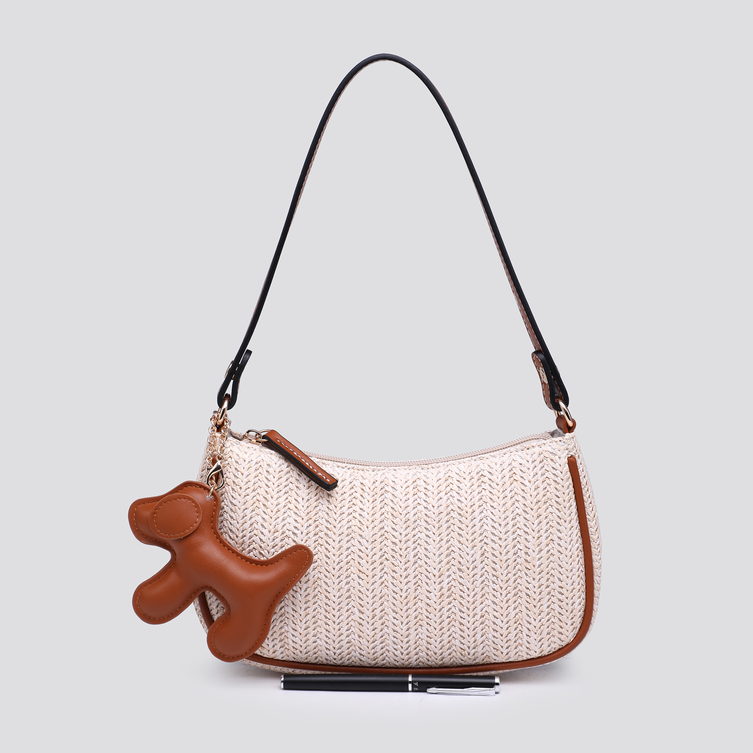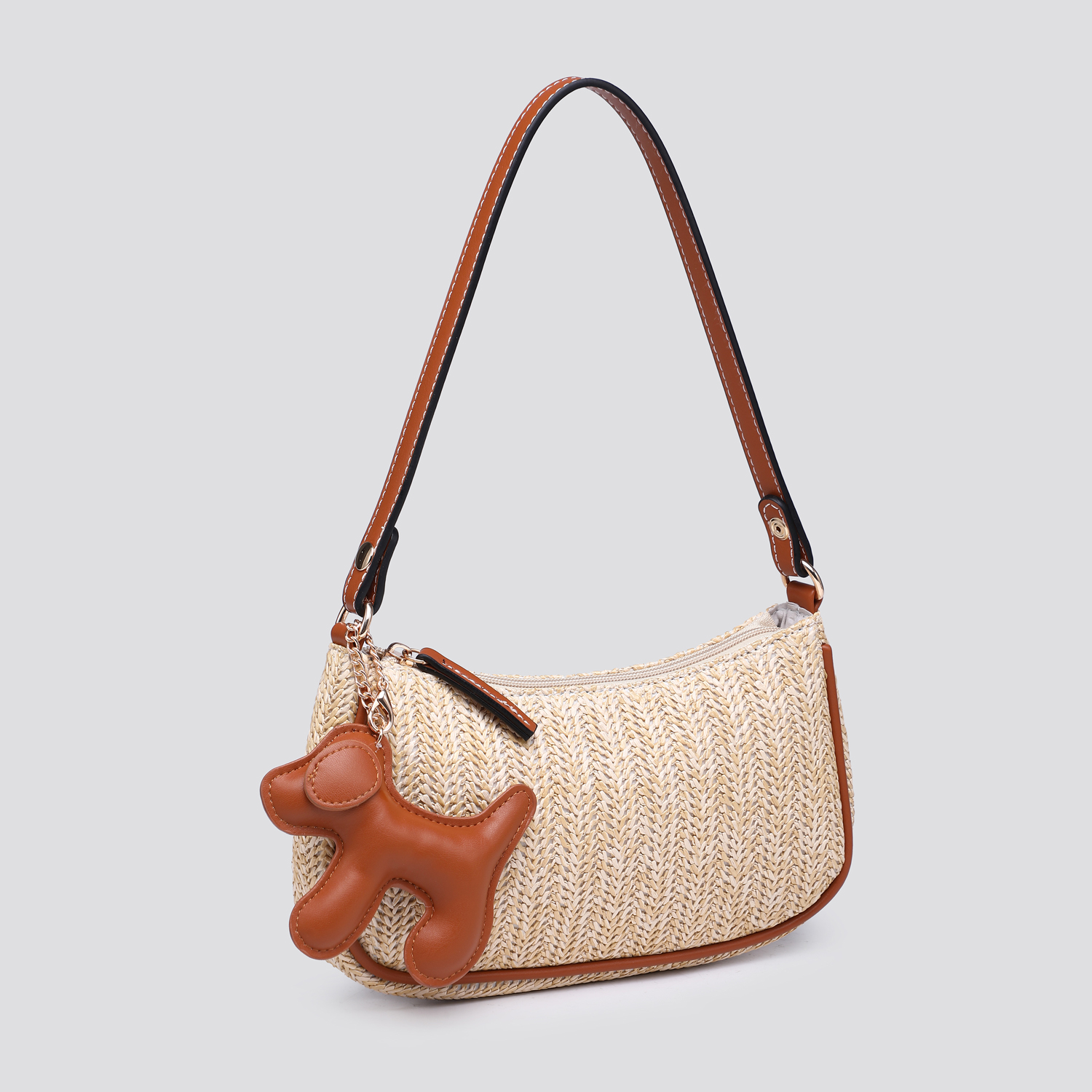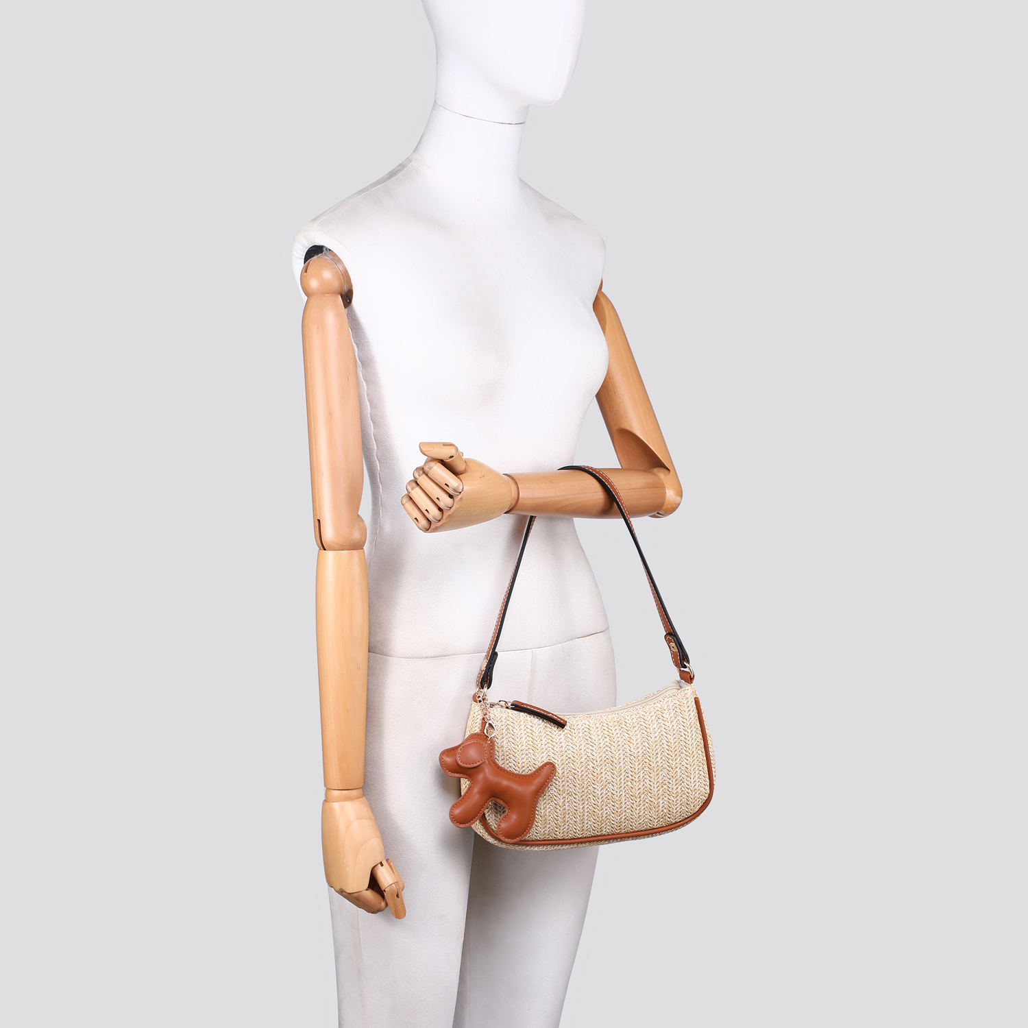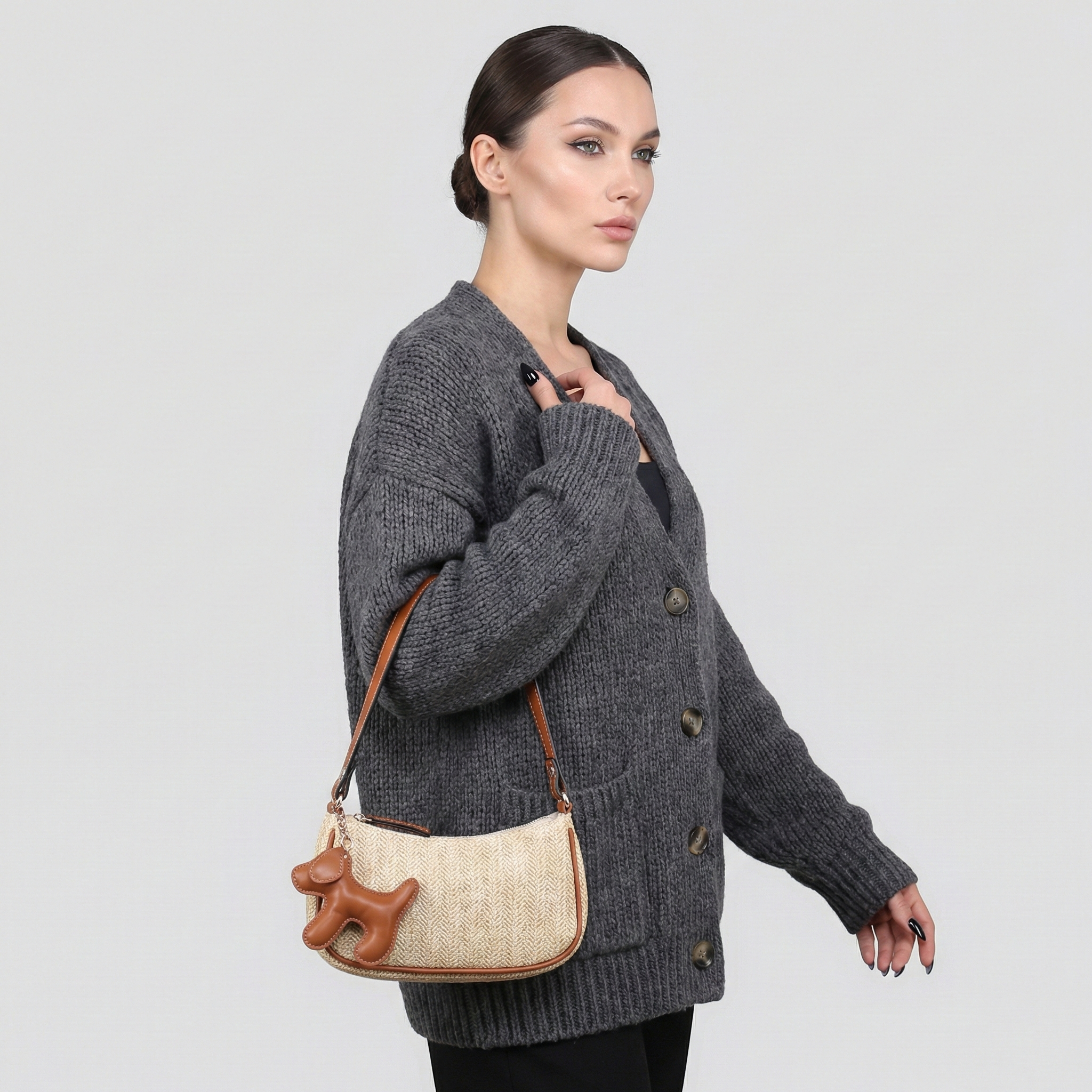 Channel a vintage-inspired aesthetic with this trendy crescent shoulder bag, perfectly sized for your essentials. The exterior features an intricate herringbone weave that adds rich, natural texture to your look, framed by smooth, contrasting trim for a polished finish. Accented with a whimsical, puffy bag charm, this accessory effortlessly blends sophistication with a touch of playful personality.