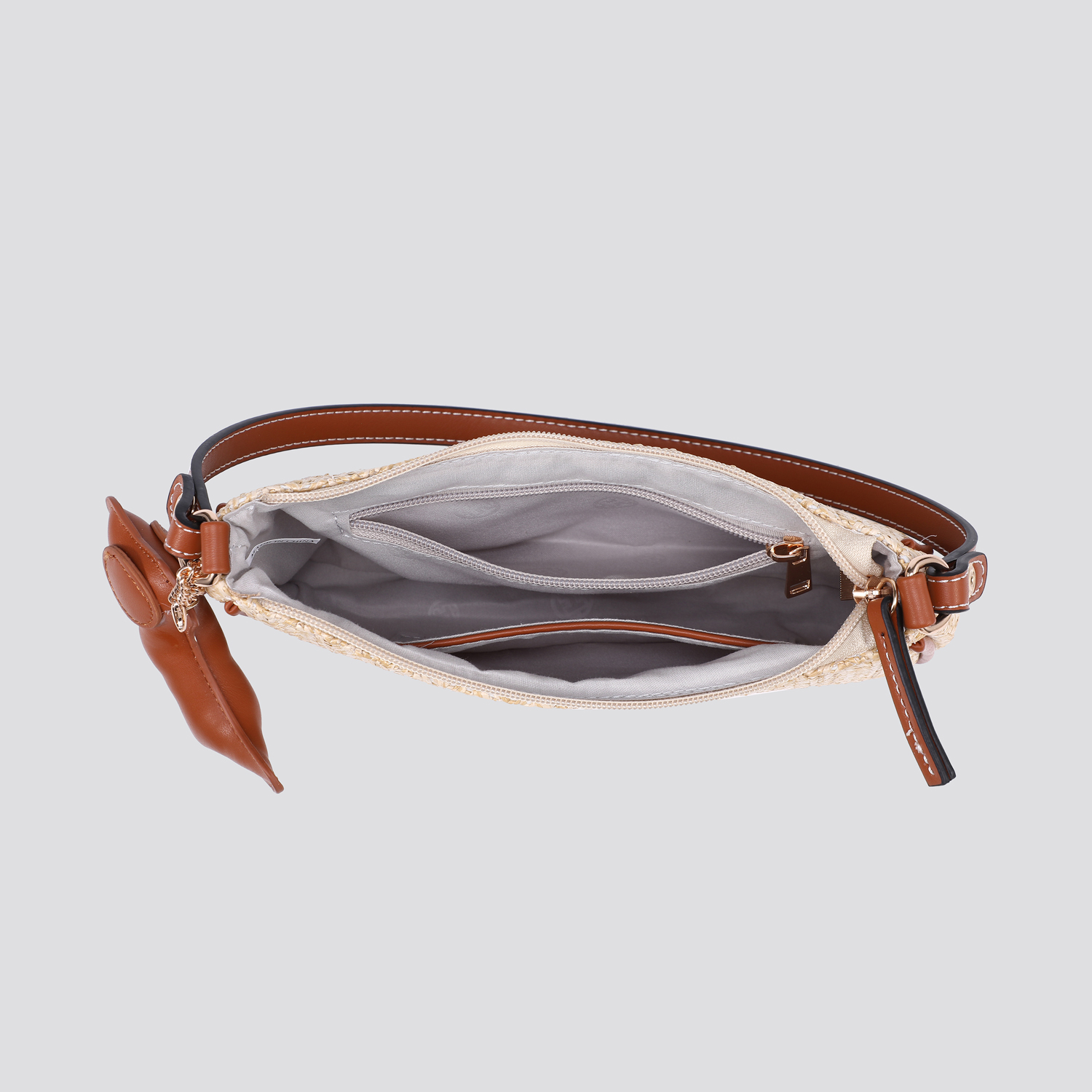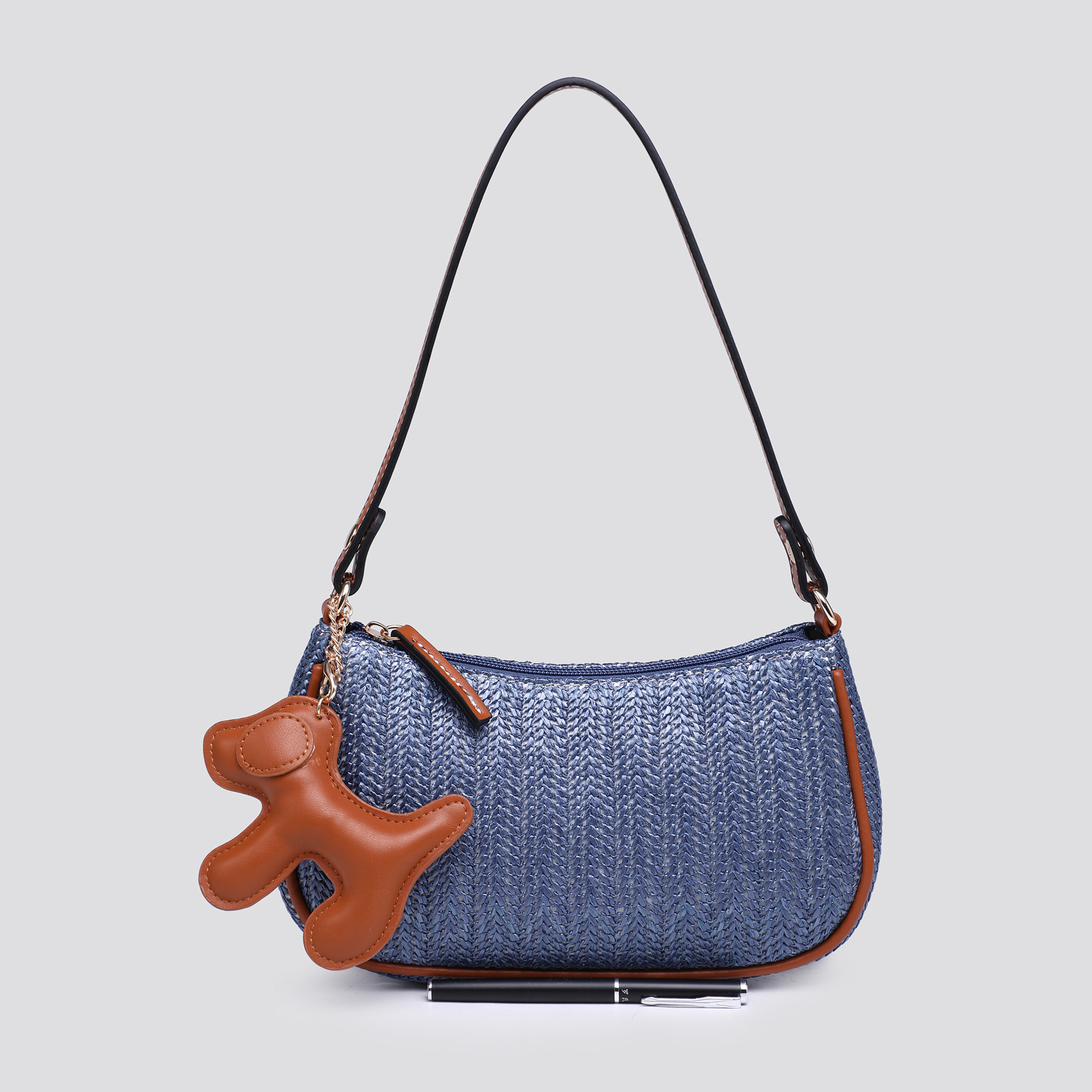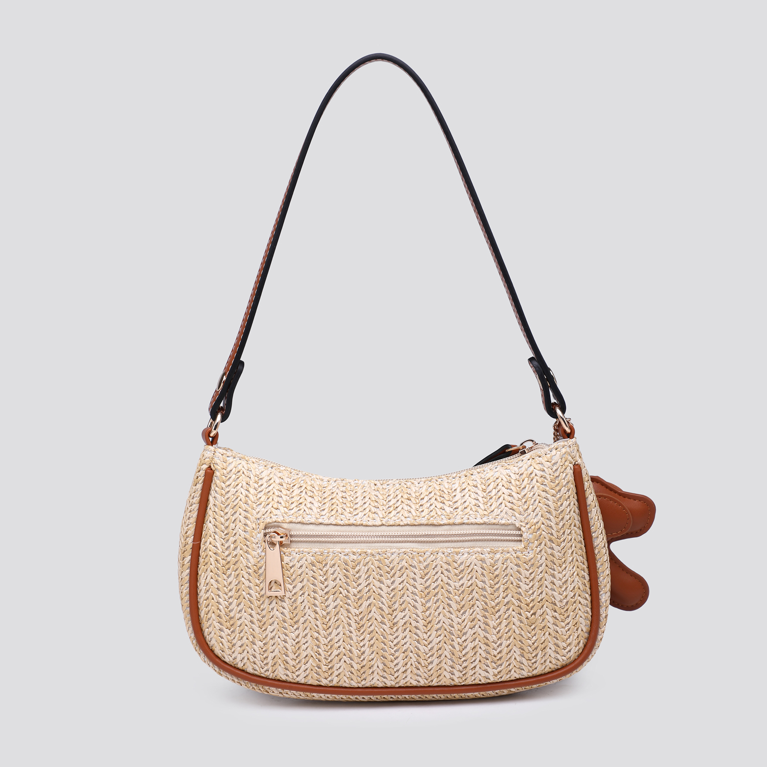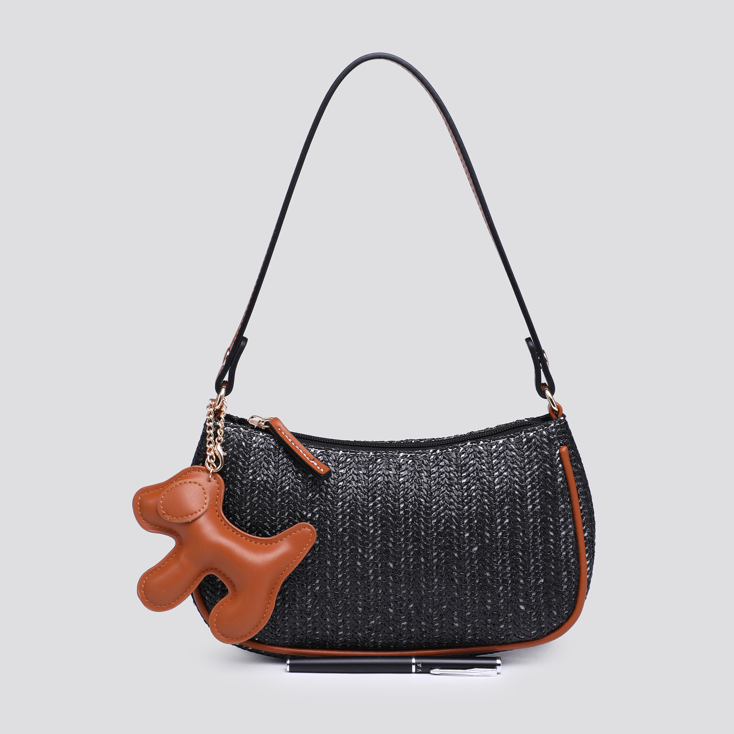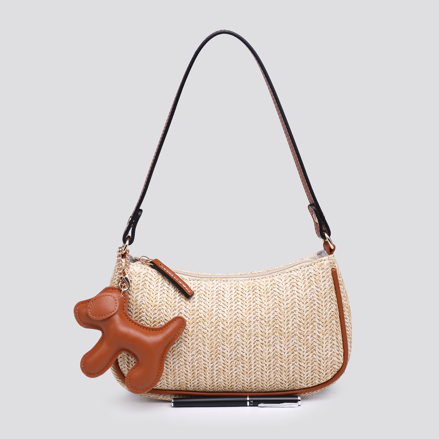 Channel a vintage-inspired aesthetic with this trendy crescent shoulder bag, perfectly sized for your essentials. The exterior features an intricate herringbone weave that adds rich, natural texture to your look, framed by smooth, contrasting trim for a polished finish. Accented with a whimsical, puffy bag charm, this accessory effortlessly blends sophistication with a touch of playful personality.