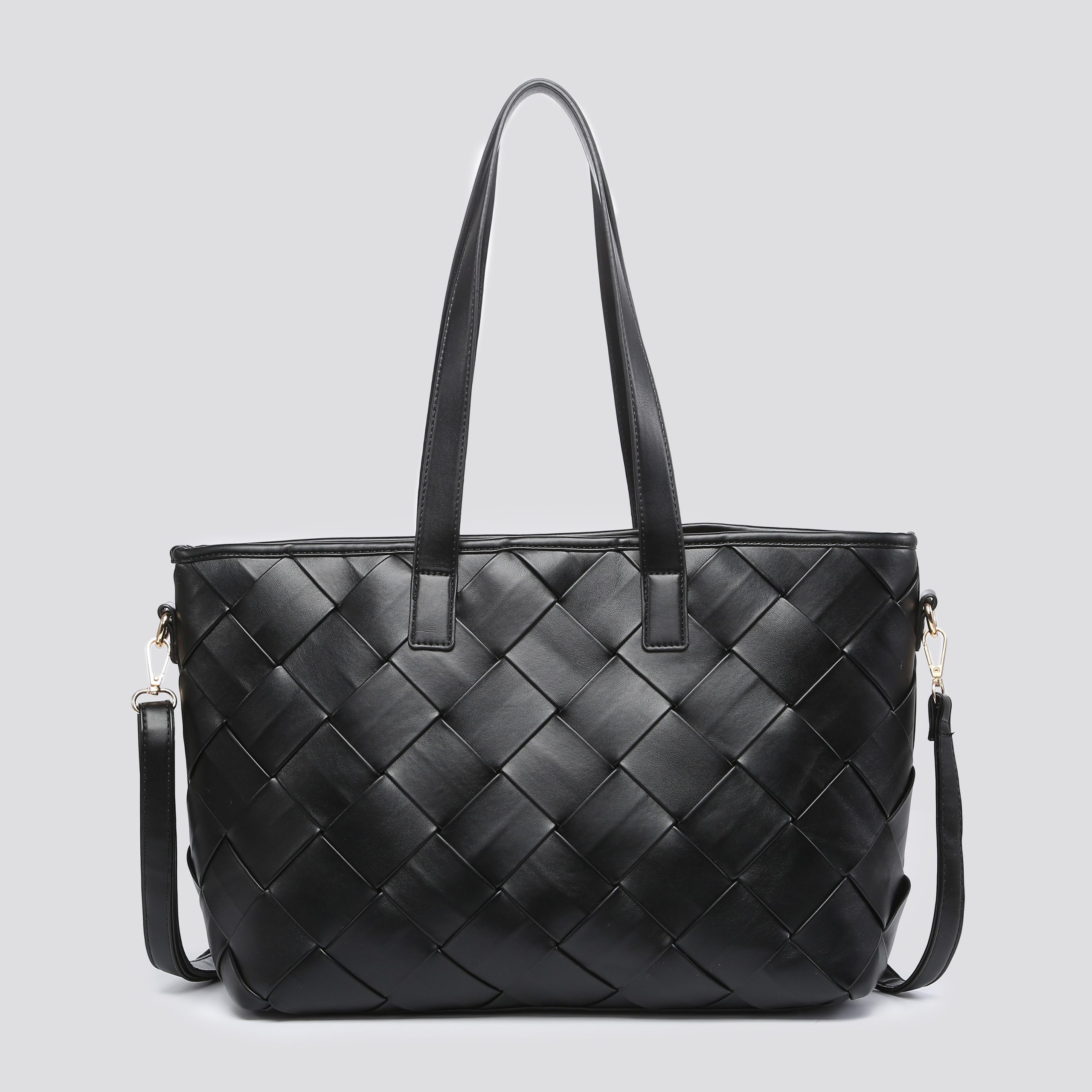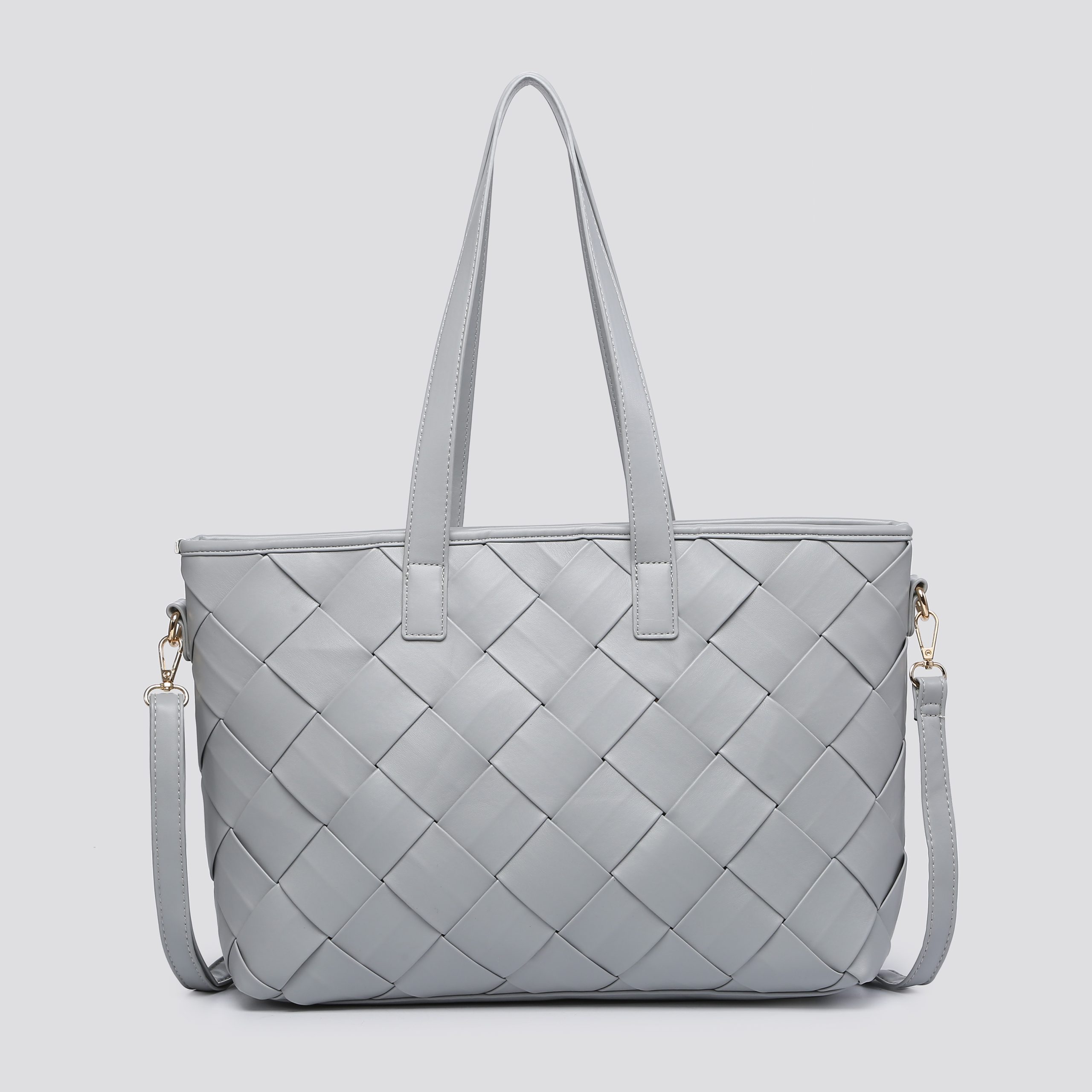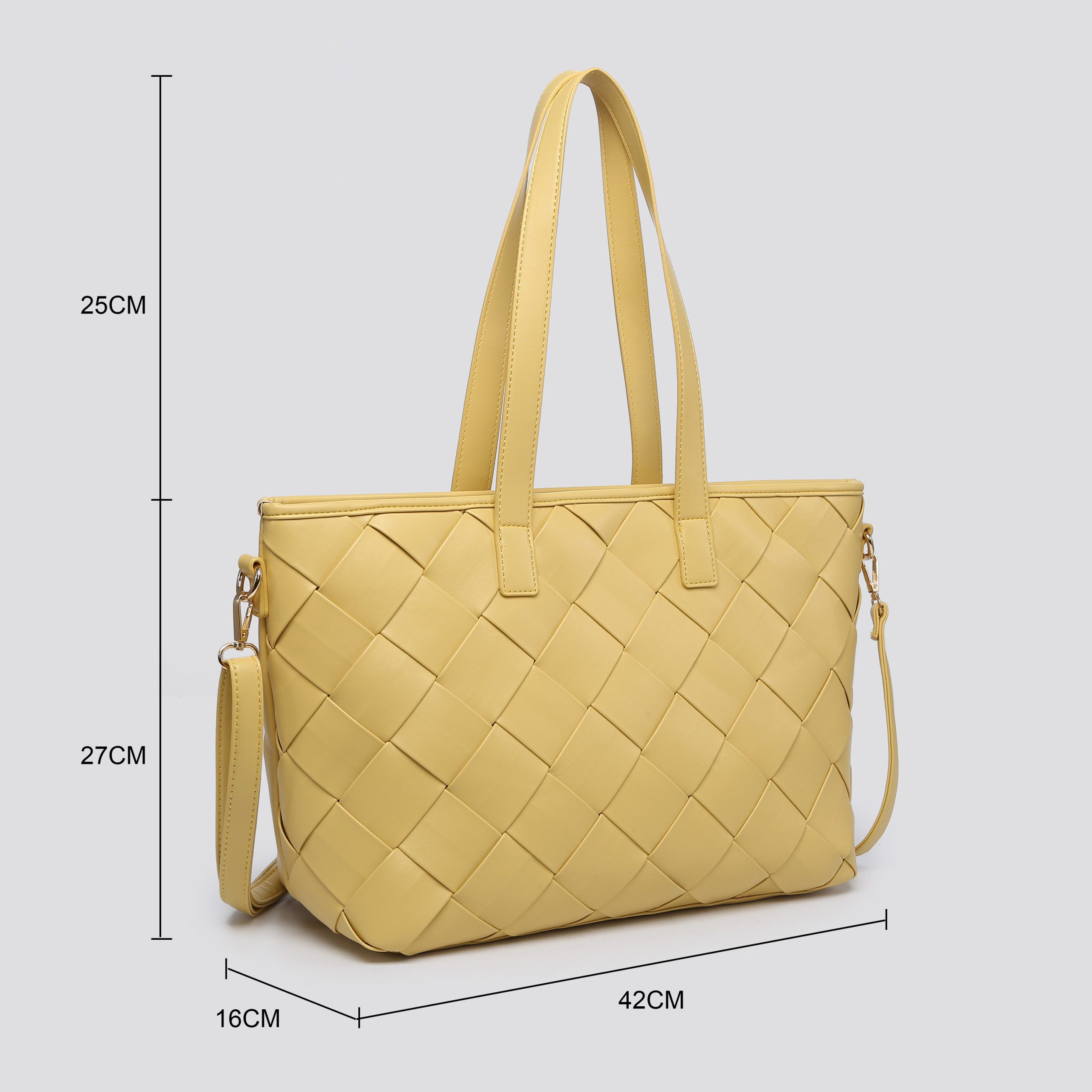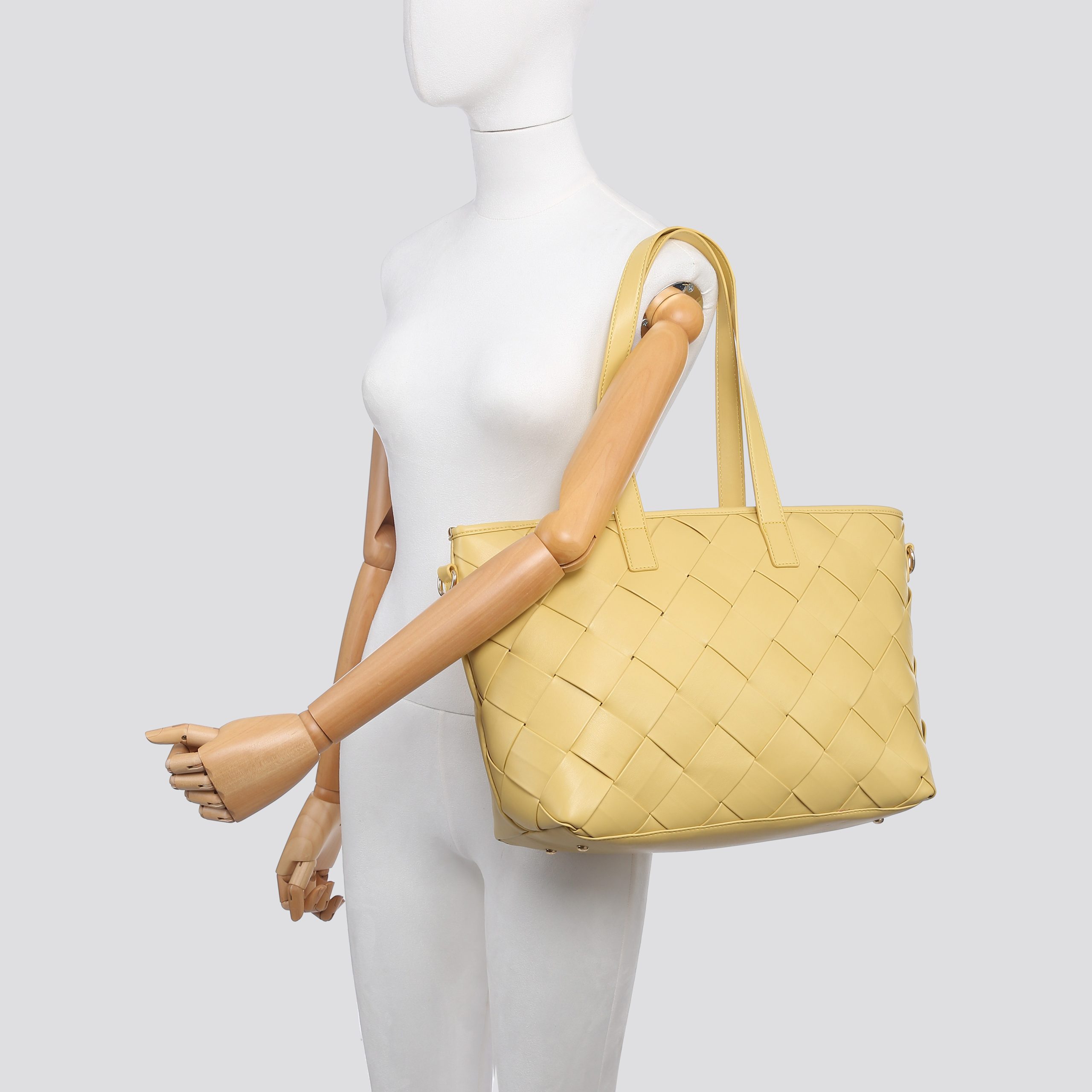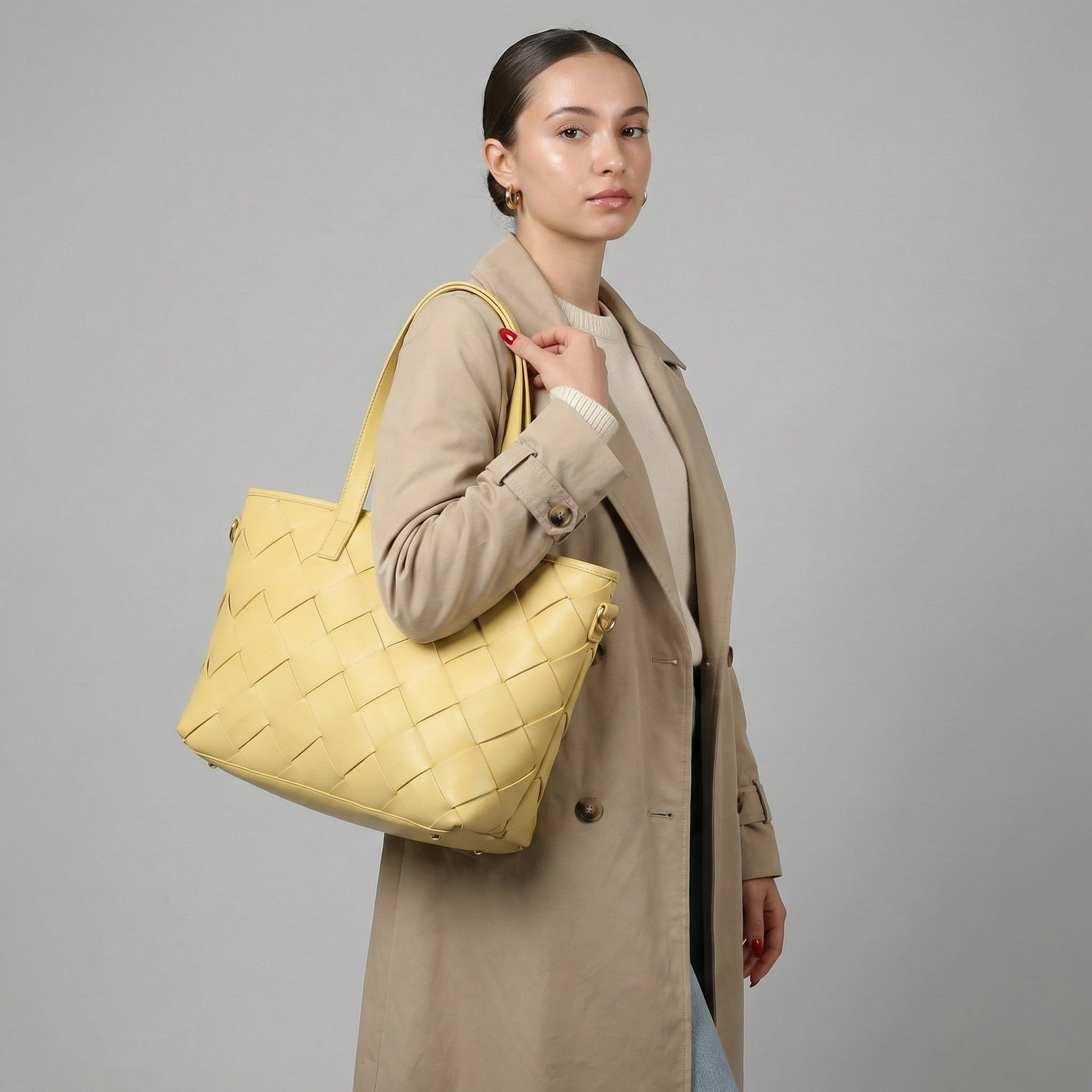 Elevate your everyday style with this sophisticated tote, defined by its intricate, wide-woven texture. The interlaced design adds a layer of artisanal depth to the smooth, structured silhouette, making it a standout piece that feels both modern and timeless. Spacious and refined, this accessory is perfectly sized to carry your daily world with effortless elegance.